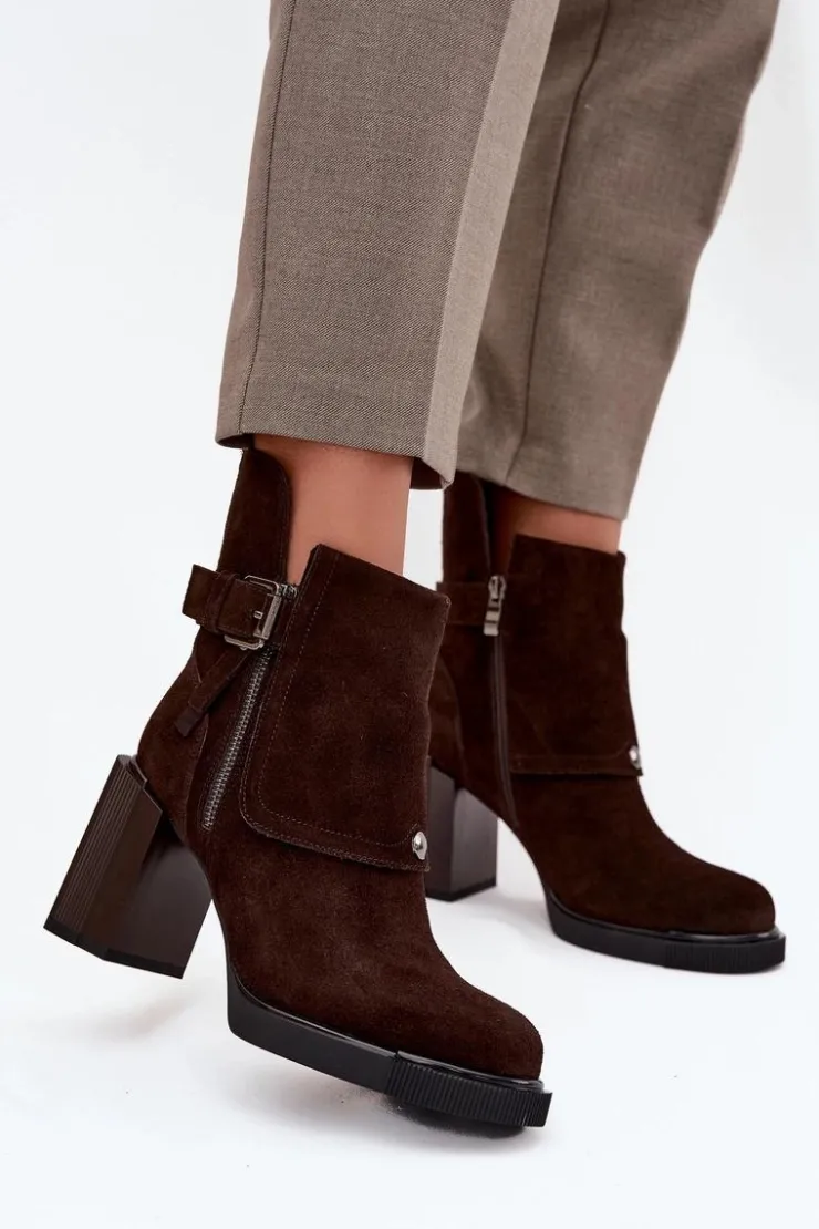 Botki damskie marki Vinceza wykonane z naturalnego zamszu to elegancka propozycja na chłodniejsze dni. Osadzone na stabilnym obcasie typu słupek wysmukla sylwetkę. Model zapinany na praktyczny zamek ułatwia zakładanie, a delikatne ocieplenie gwarantuje ciepło. Stylowym akcentem jest pasek z klamrą umieszczony na górze cholewki, który nadaje całości modnego i kobiecego charakteru. To uniwersalne botki, które świetnie sprawdzą się zarówno w codziennych, jak i eleganckich stylizacjach. Przy wyborze rozmiaru prosimy sugerować się tabelą rozmiarów.
