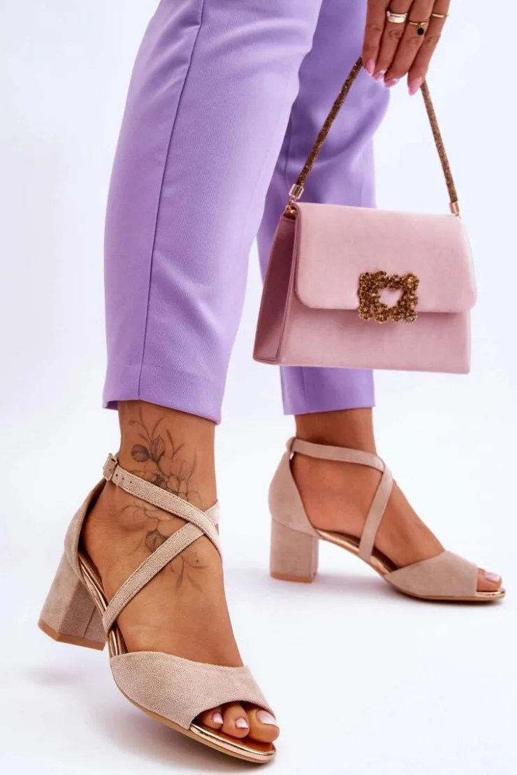 Modne sandałki z krzyżującymi się na środku paskami. Posiadają obcas w postaci niskiego słupka. Sandałki posiadają odkryty, zaokrąglony nosek oraz usztywniany zapiętek. Zapinane wokół kostki na regulowany pasek ze sprzączką. Miękka wkładka pozwoli na komfortowe użytkowanie obuwia. Świetnie sprawdzą się podczas różnego rodzaju imprez, uroczystości czy spotkań.Przy wyborze rozmiaru prosimy sugerować się tabelą rozmiarów.