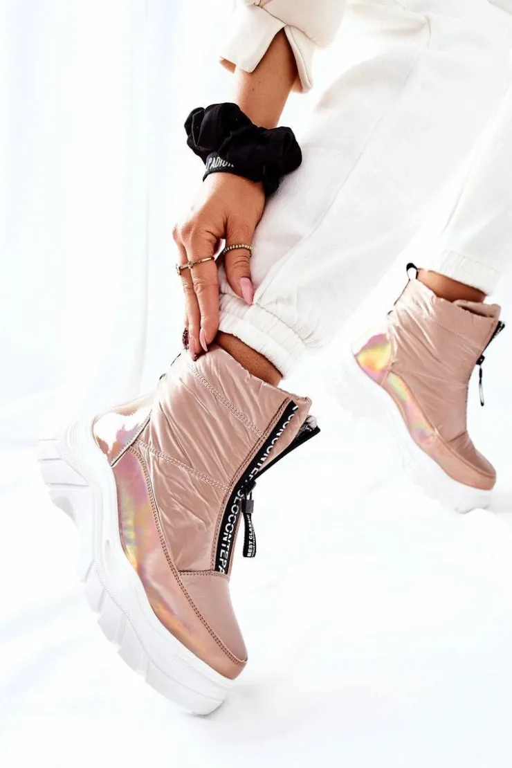 Damskie botki wykonane ze skóry ekologicznej oraz materiału tekstylnego. Zapinane z przodu cholewki na zamek. Ocieplane kocem obuwniczym.