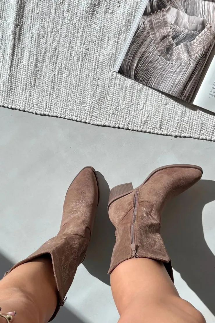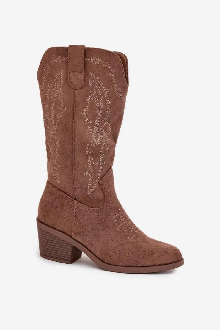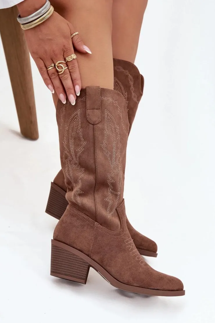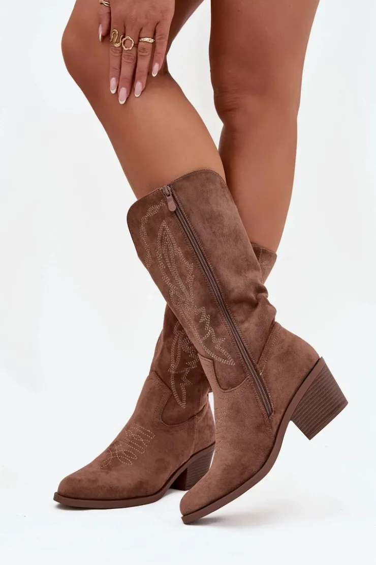 Kozaki kowbojki od marki Vinceza to połączenie klasycznego westernowego stylu z nowoczesnym, miejskim lookiem. Wykonane z eko zamszu, prezentują się lekko i stylowo, a charakterystyczne przeszycia podkreślają kowbojski charakter butów. Noski w kształcie migdała dodają im kobiecego akcentu, a stabilny obcas zapewnia wygodę i pewny krok. Model jest ocieplany, co gwarantuje komfort w chłodniejsze dni, a zamek po boku ułatwia szybkie zakładanie. Przy wyborze rozmiaru prosimy sugerować się tabelą rozmiarów.