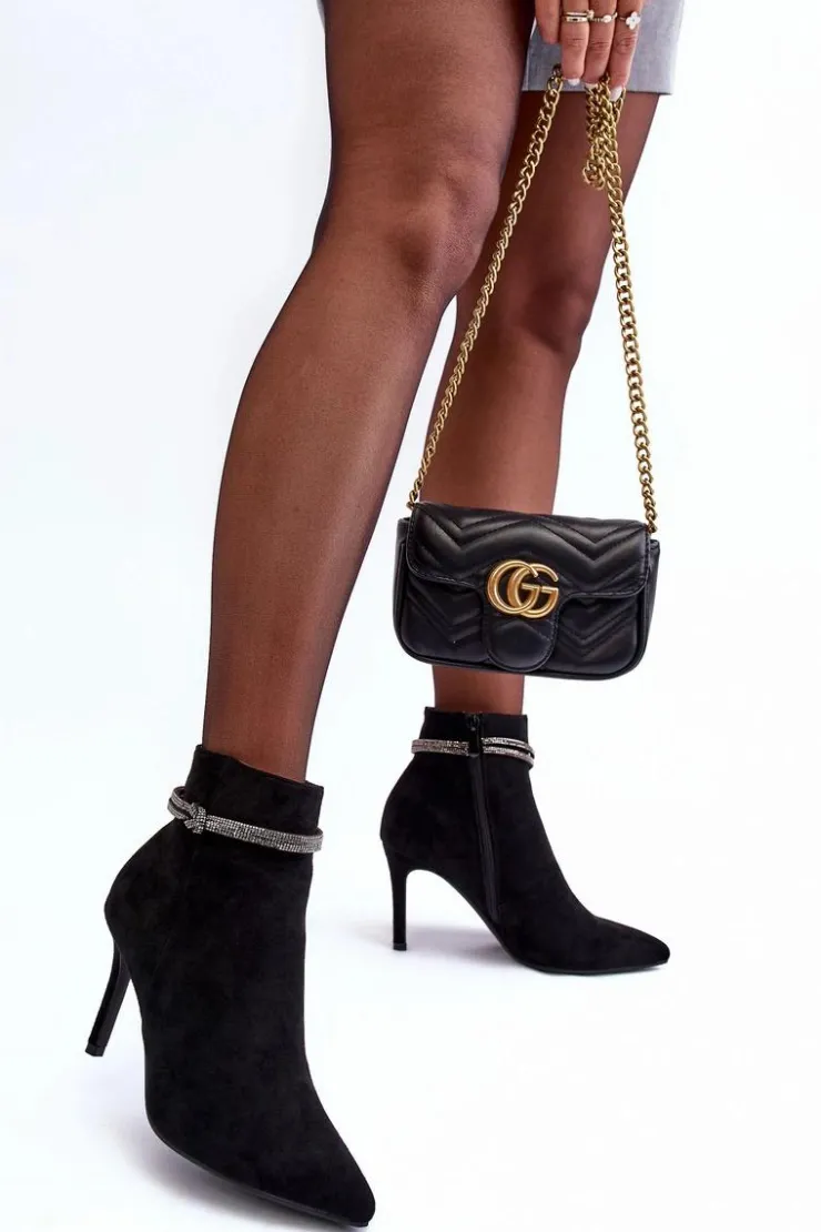 Botki damskie wykonane z eko zamszu. Osadzone na obcasie w postaci szpilki. Na cholewce dwa splecione paseczki, które posiadają liczne, błyszczące dżety. Model zapinany na suwak z boku. Noski w szpic optycznie wysmuklą nogi. Dodatkowo zapiętek jest usztywniony. Botki świetnie sprawdzą się w wielu stylizacjach np.: do sukienek, spódnic czy spodni. Koniecznie powinny znaleźć się w Twojej szafie! Przy wyborze rozmiaru prosimy sugerować się tabelą rozmiarów.