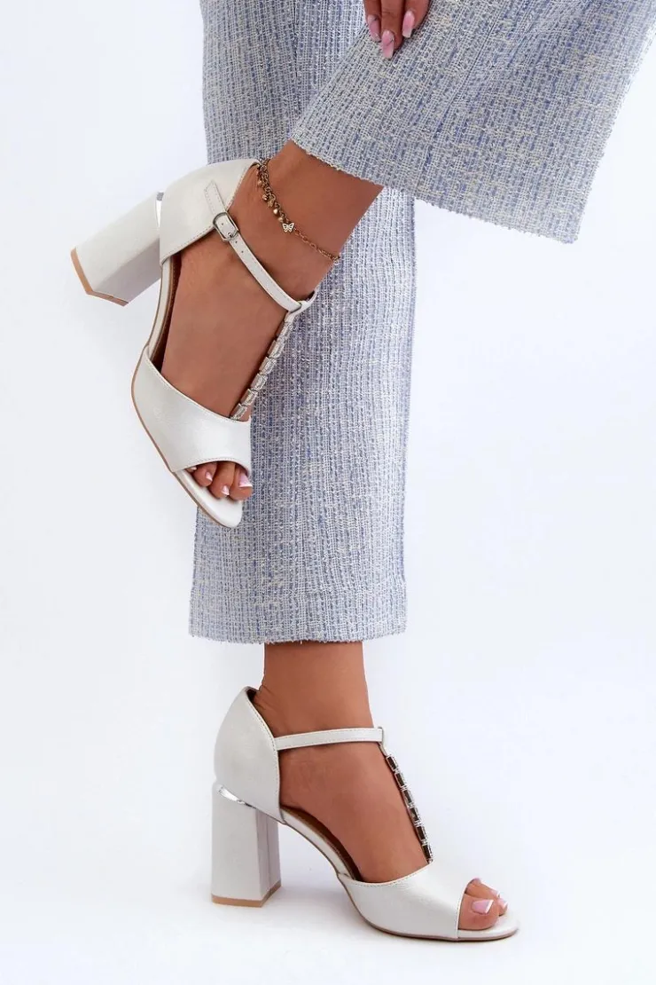 Klasyczne sandałki damskie zostały wykonane z eko skóry. Model ten został ozdobiony mieniącymi się dżetami imitującymi cyrkonie. Sandałki posiadają usztywniany zapiętek oraz eko skórzaną, miękką wkładkę. Model ten został osadzony na obcasie w postaci słupka i jest zapinany na regulowany pasek ze sprzączką. Przy wyborze rozmiaru prosimy sugerować się tabelą rozmiarów.