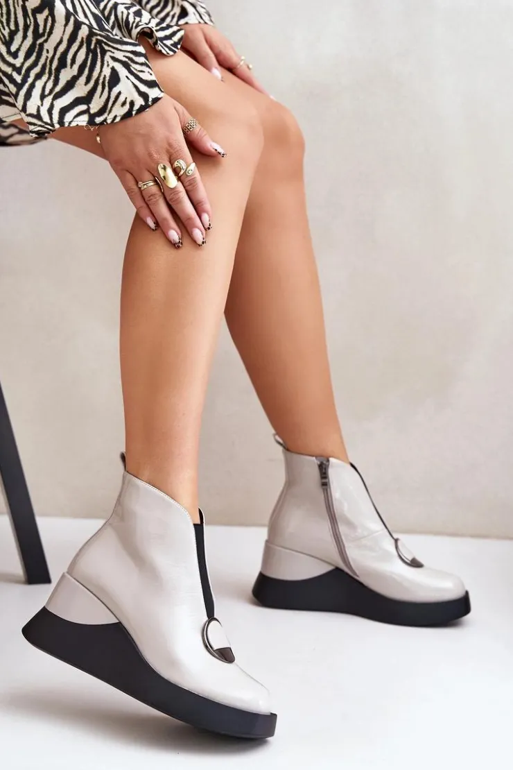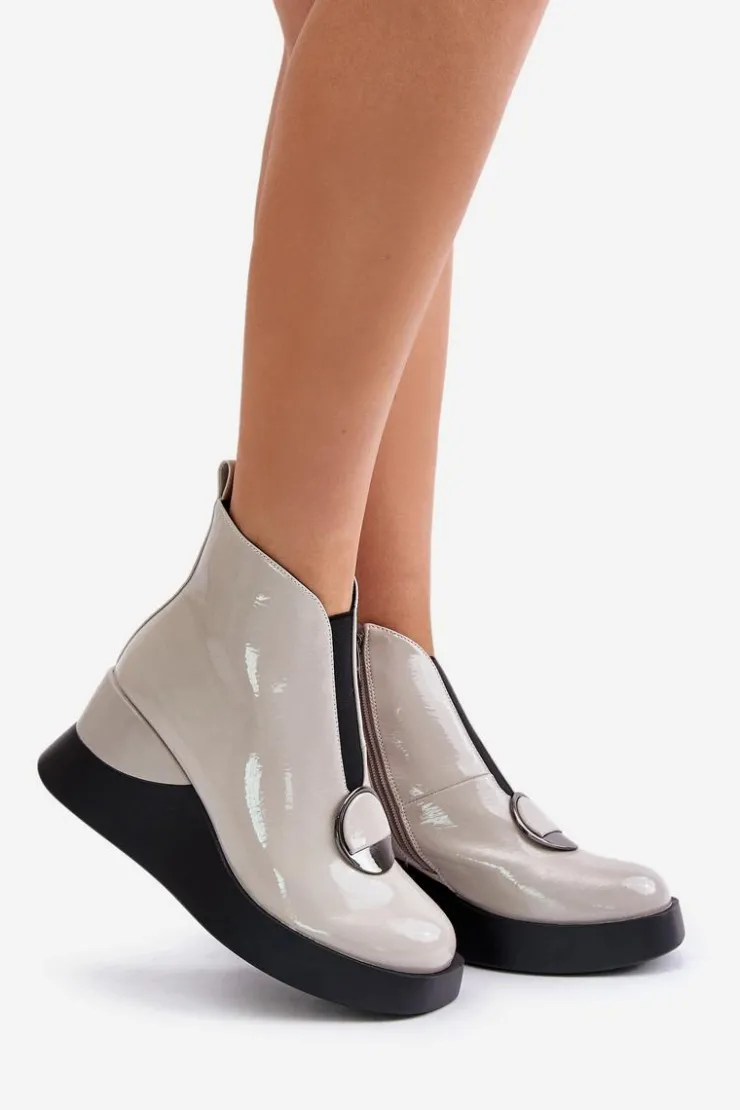 Eleganckie botki damskie osadzone na koturnie i platformie. Wykonane z eko skóry. Zapinane na suwak z boku. Z Przodu elastyczna wstawka oraz ozdoba. Noski zaokrąglone. Środek ocieplony kocem obuwniczym. Model ten z pewnością dopełni wiele jesienno-zimowych stylizacji! Przy wyborze rozmiaru prosimy sugerować się tabelą rozmiarów.