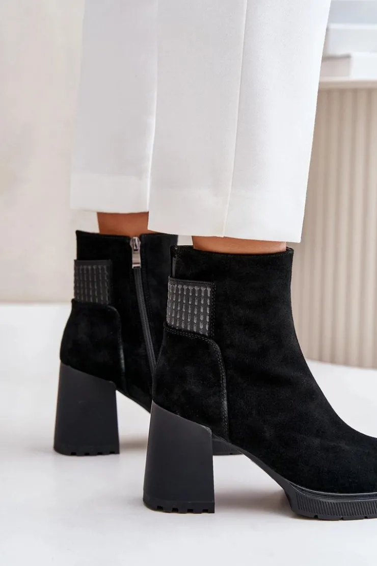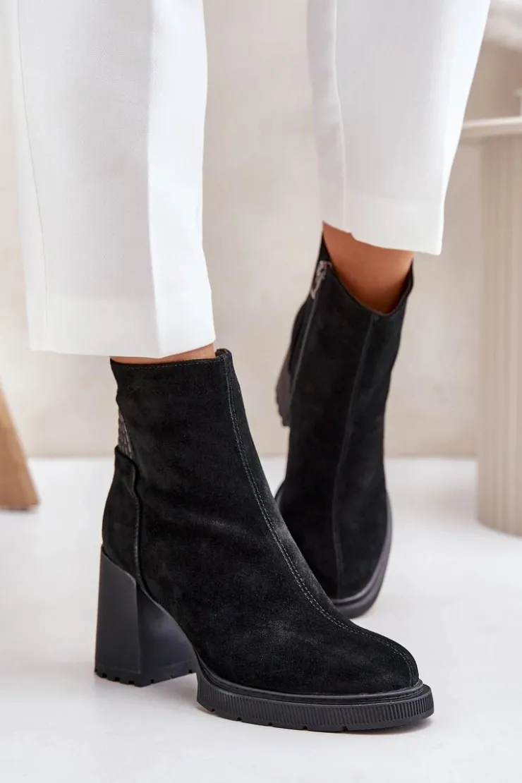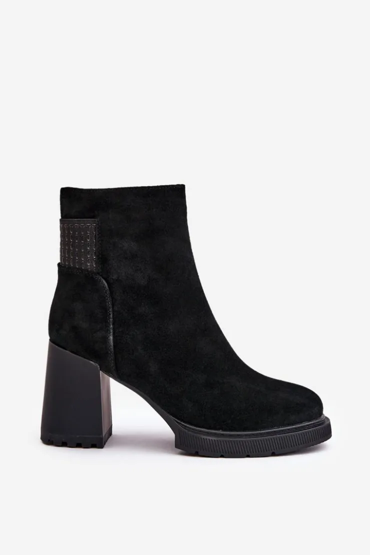 Eleganckie botki wykonane z naturalnego zamszu to idealny wybór na chłodniejsze dni. Osadzone na stabilnym obcasie typu słupek, zapewniają komfort noszenia przez cały dzień. Wnętrze ocieplone kocem obuwniczym, co gwarantuje ciepło i wygodę nawet podczas mroźnych dni. Dzięki praktycznemu zapięciu na zamek, zakładanie i zdejmowanie jest szybkie i łatwe. Przy wyborze rozmiaru prosimy sugerować się tabelą rozmiarów.