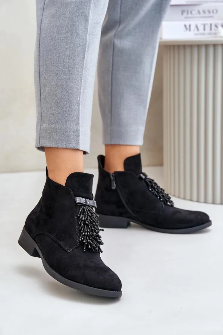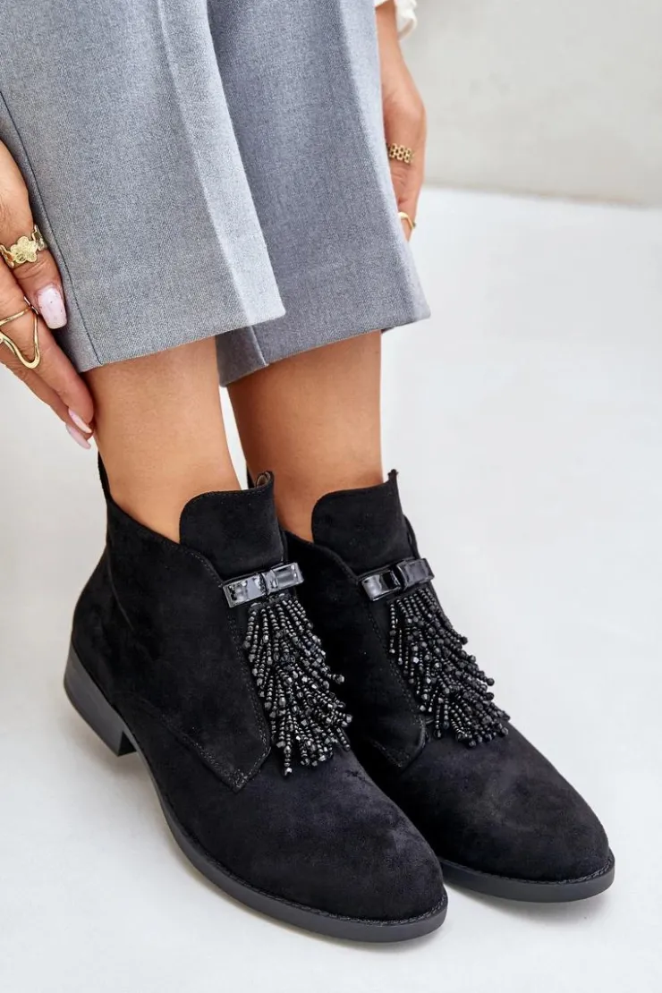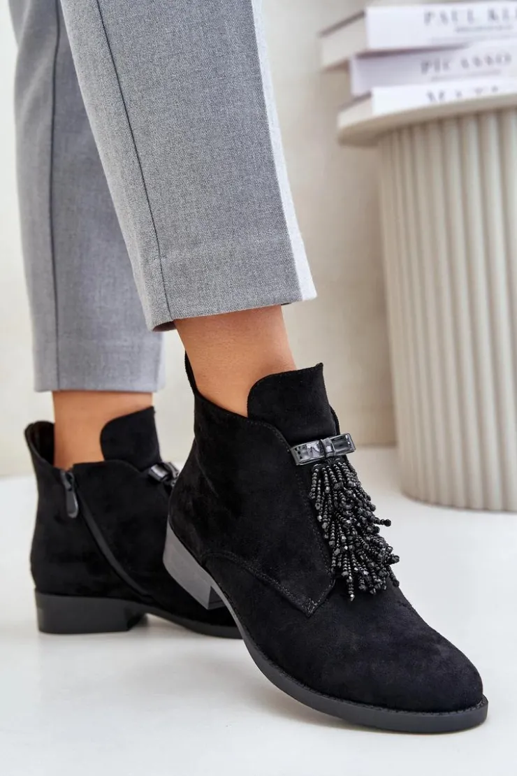 Botki damskie z cholewką do kostki od marki S.Barski. Wykonane z eko zamszu. Osadzone na płaskim obcasie, który zapewni stabilność na każdym kroku. Noski zaokrąglone. Głównym atutem tego modelu jest ozdoba z przodu, która nadaje wyjątkowego uroku. Model ten posiada ocieplenie w postaci koca obuwniczego. Przy wyborze rozmiaru prosimy sugerować się tabelą rozmiarów.