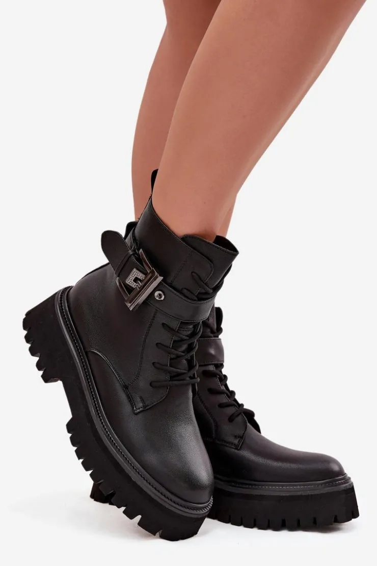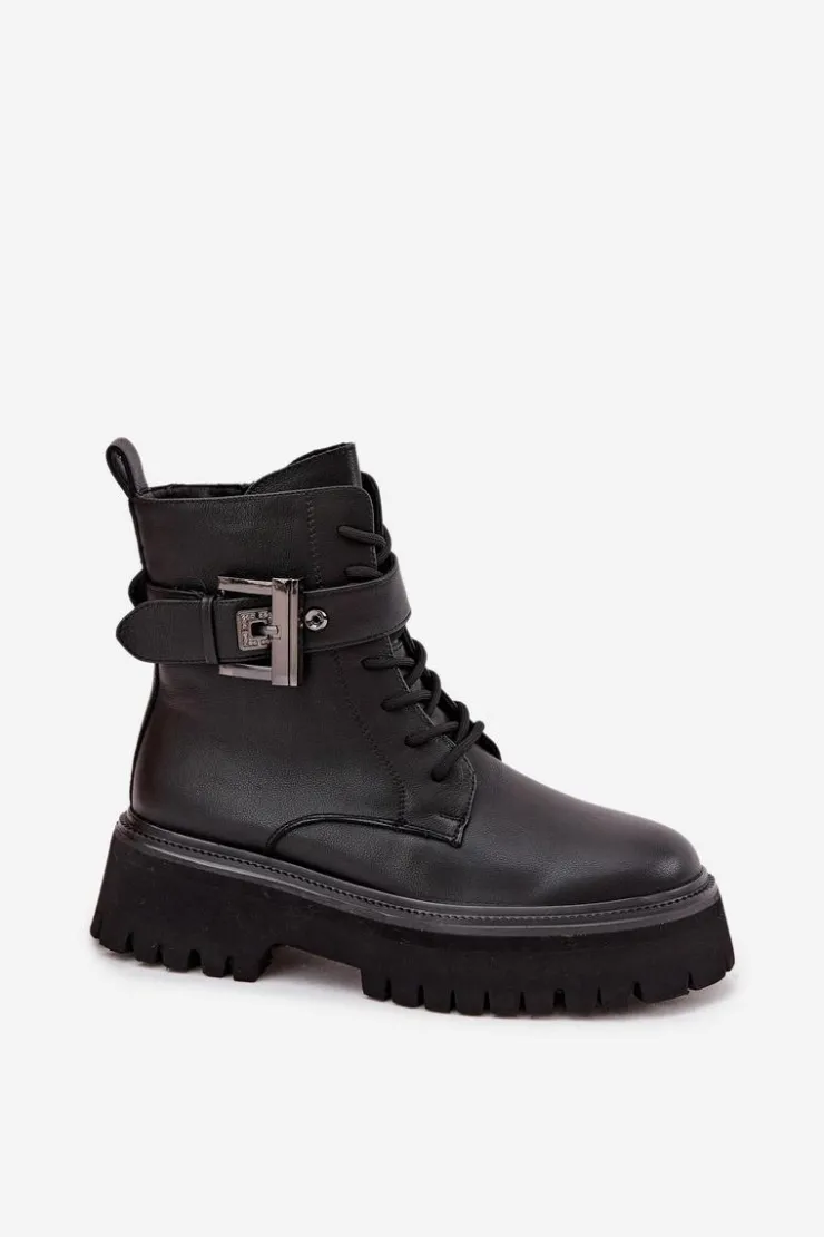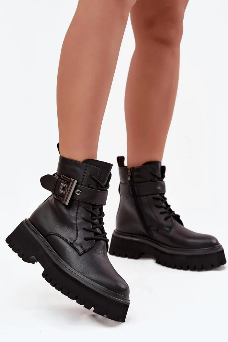 Botki workery damskie wykonane z naturalnej skóry. Model osadzony na platformie zapewnia stabilność oraz wygodę noszenia. Buty są sznurowane i zapinane na zamek, dzięki czemu doskonale dopasowują się do stopy i łatwo je zakładać. Wnętrze zostało ocieplone, co gwarantuje komfort i ciepło w chłodniejsze dni. Ozdobny pasek z klamrą nadaje im charakteru i modnego, lekko rockowego stylu. To doskonały wybór do codziennych stylizacji. Przy wyborze rozmiaru prosimy sugerować się tabelą rozmiarów.