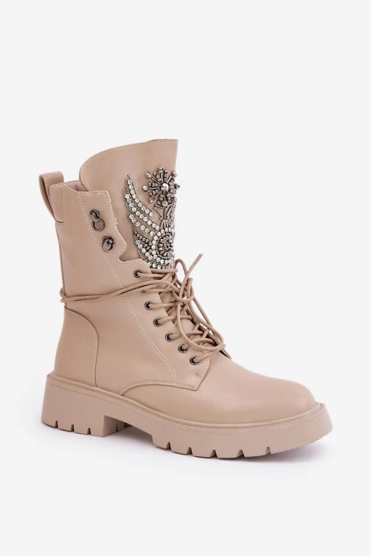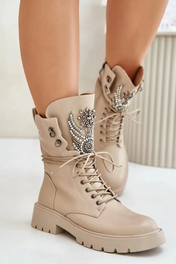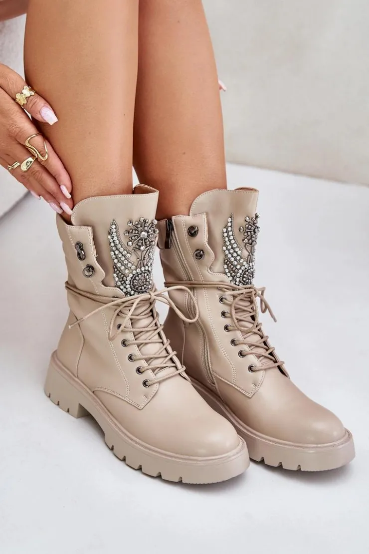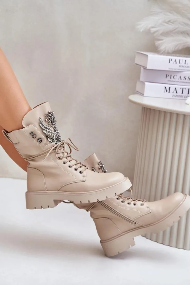 Ocieplane botki workery wykonane z eko skóry to stylowa i funkcjonalna propozycja na chłodniejsze dni. Osadzone na płaskim obcasie, zapewniają komfort noszenia, a dzięki zapięciu na zamek i sznurowaniu łatwo je dopasować do stopy. Zaokrąglone noski dodają klasycznego wyglądu, a zdobienie na języku wprowadza modny akcent. To idealny wybór dla osób ceniących wygodę i oryginalny design w codziennych stylizacjach. Przy wyborze rozmiaru prosimy sugerować się tabelą rozmiarów.