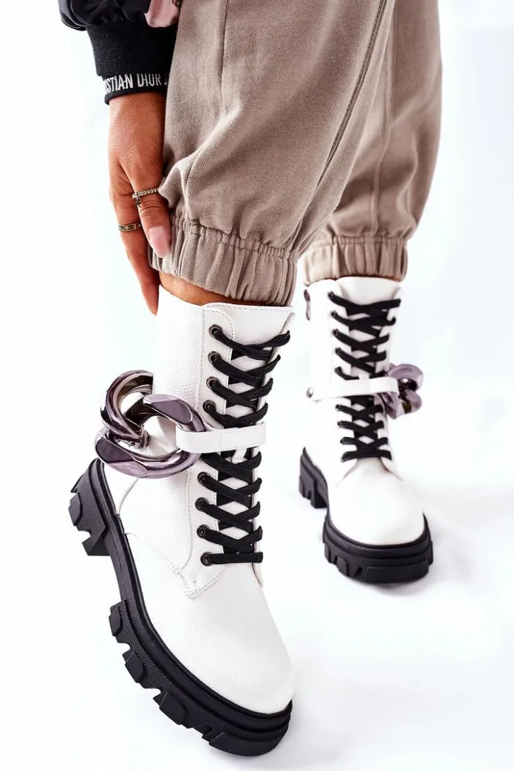 Szukasz mocniejszego stylu? Dobrze trafiłaś, bo te botki spełniają Twoje wymagania! Noś na różne sposoby, ozdobę – łańcuch możesz dowolnie odpiąć. Wysoka cholewka oraz masywna podeszwa – co tu więcej dodawać? Klasyczny fason ze sznurowaniem. Odporna na zabrudzenia skóra ekologiczna, to najlepszy wybór na jesienno-zimowe spacery. Przy wyborze rozmiaru prosimy sugerować się tabelą rozmiarów.