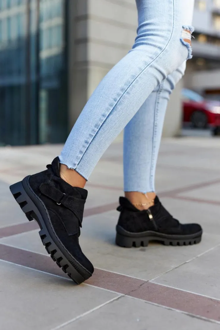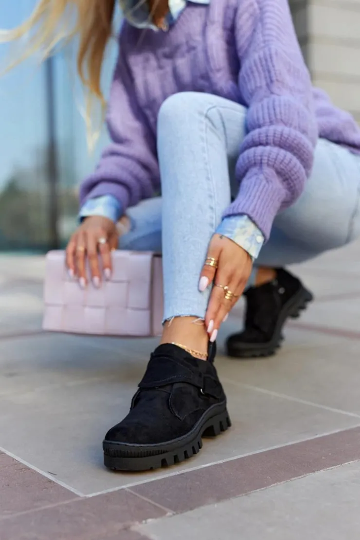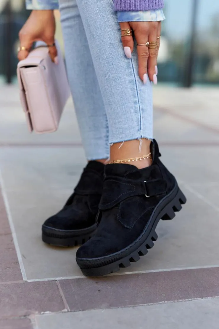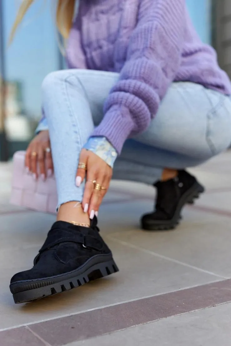 Traperki na grubej podeszwie z wysokim bieżnikiem. Cholewka wykonana z eko zamszu z suwakiem z boku oraz dodatkowym rzepem. Buty posiadają okrągły nosek. Z tyłu cholewki znajduje się bootstrap, czyli pętelka ułatwiająca zakładanie oraz ściąganie obuwia. Zapiętek jest usztywniany. Te trapery o nowoczesnym fasonie idealnie sprawdzą się w wiosennych stylizacjach! Przy wyborze rozmiaru prosimy sugerować się tabelą rozmiarów.