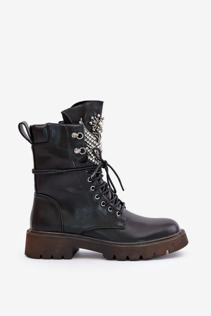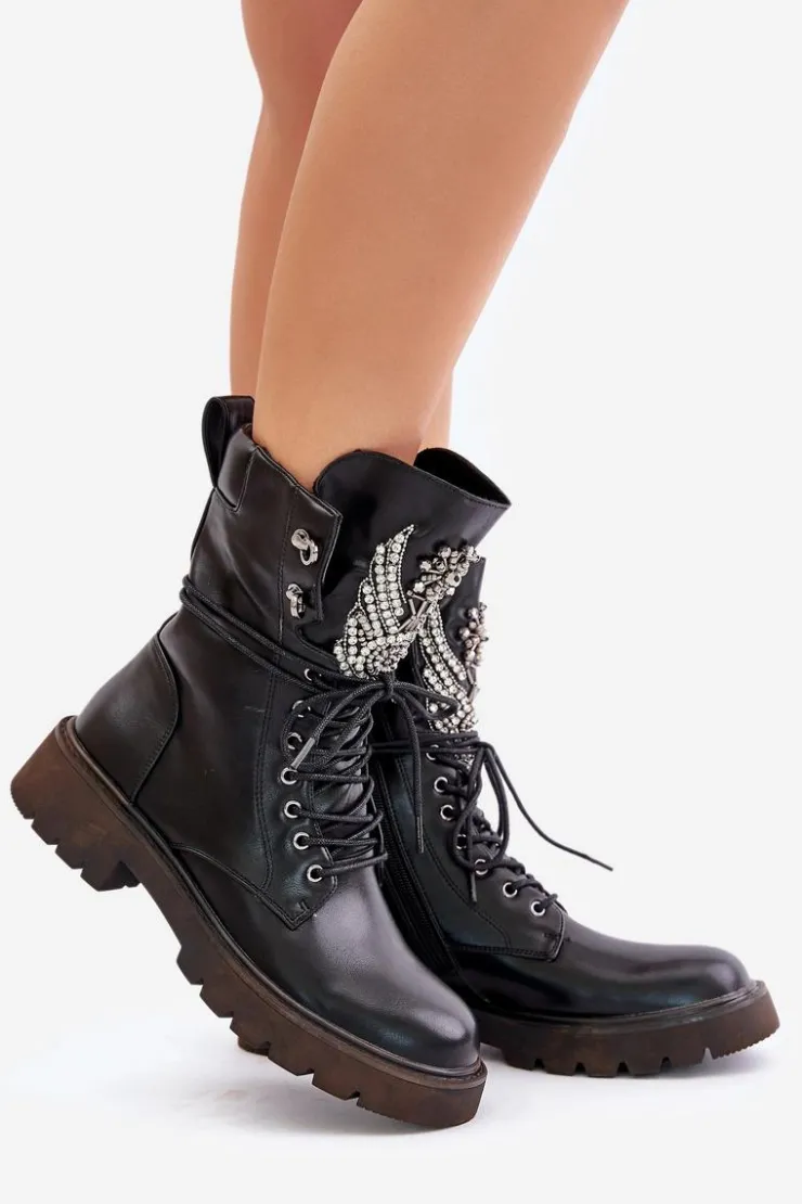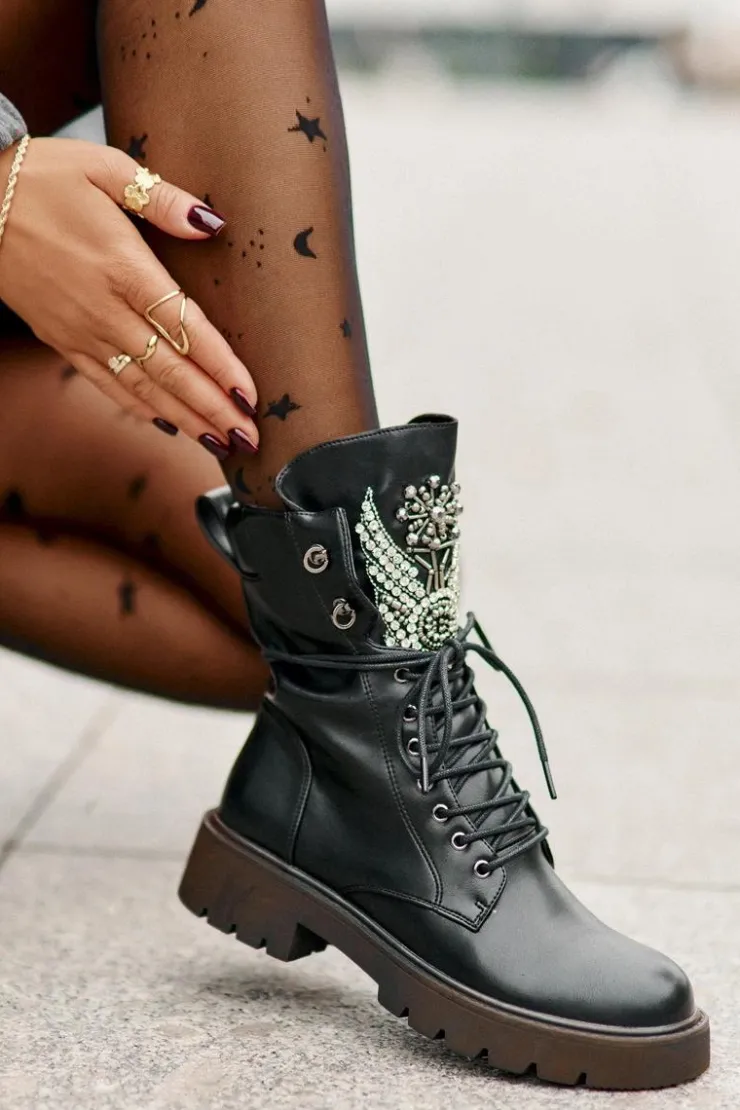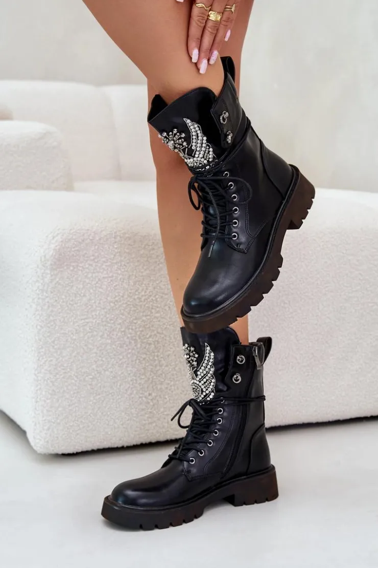 Damskie buty S.Barski Eko Skórzane Botki Workery Ze Zdobieniem Ocieplane D&A MR880-080 Czarne