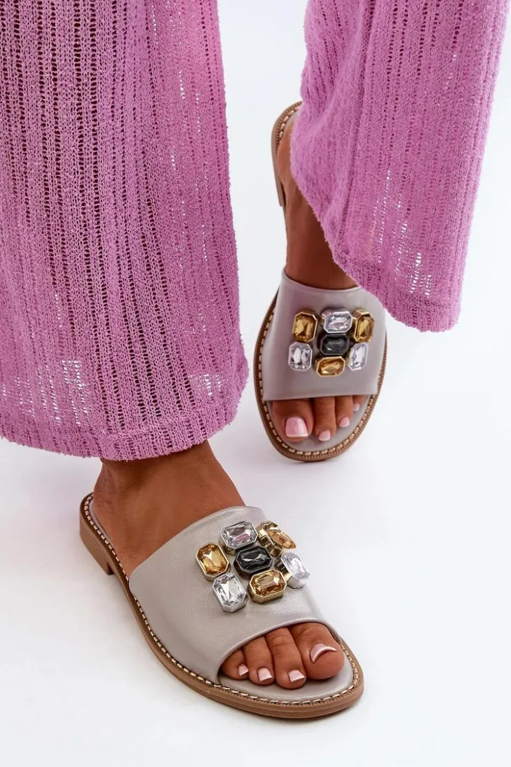 Damskie klapki na płaskim obcasie z ozdobami. Wykonane z wysokiej jakości materiałów. Miękka, skórzana wkładka zapewni komfort noszenia przez cały dzień. Elegancki design sprawia, że są idealnym wyborem na różne okazje. Przy wyborze rozmiaru prosimy sugerować się tabelą rozmiarów.