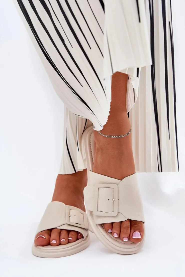 Eleganckie klapki damskie z naturalnej skóry, osadzone na płaskim obcasie, które łączą komfort z prostym stylem. Z przodu duża klamra, która dodaje im wyjątkowego charakteru. Skórzana wkładka zapewnia wygodę przez cały dzień, dbając o odpowiednią amortyzację. Doskonałe na letnie dni, te klapki będą idealnym wyborem do codziennych stylizacji, wprowadzając do nich lekkość i elegancję. Przy wyborze rozmiaru prosimy sugerować się tabelą rozmiarów.