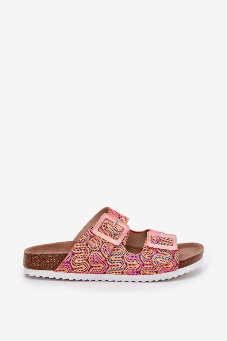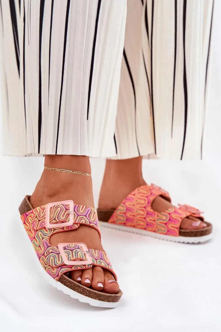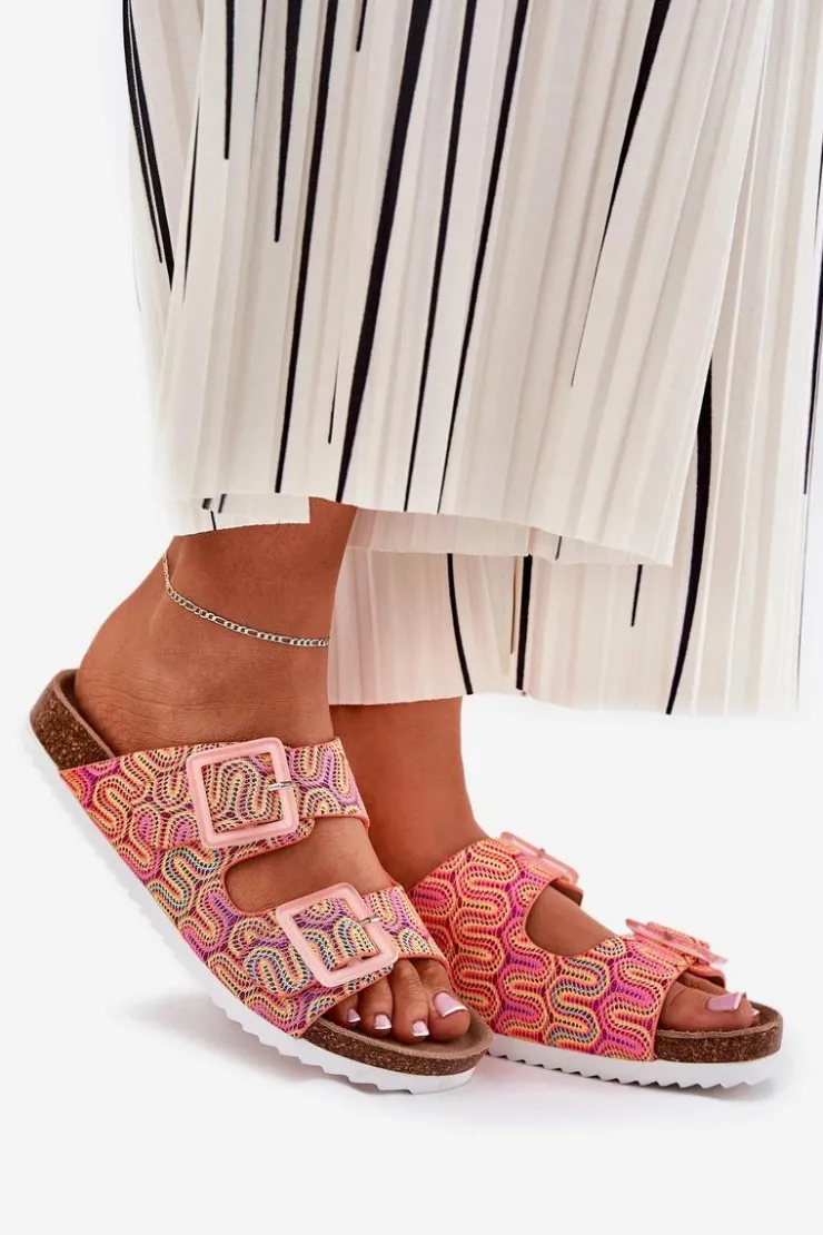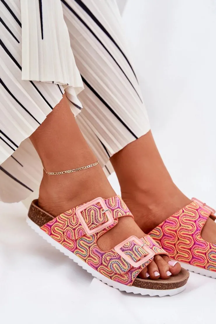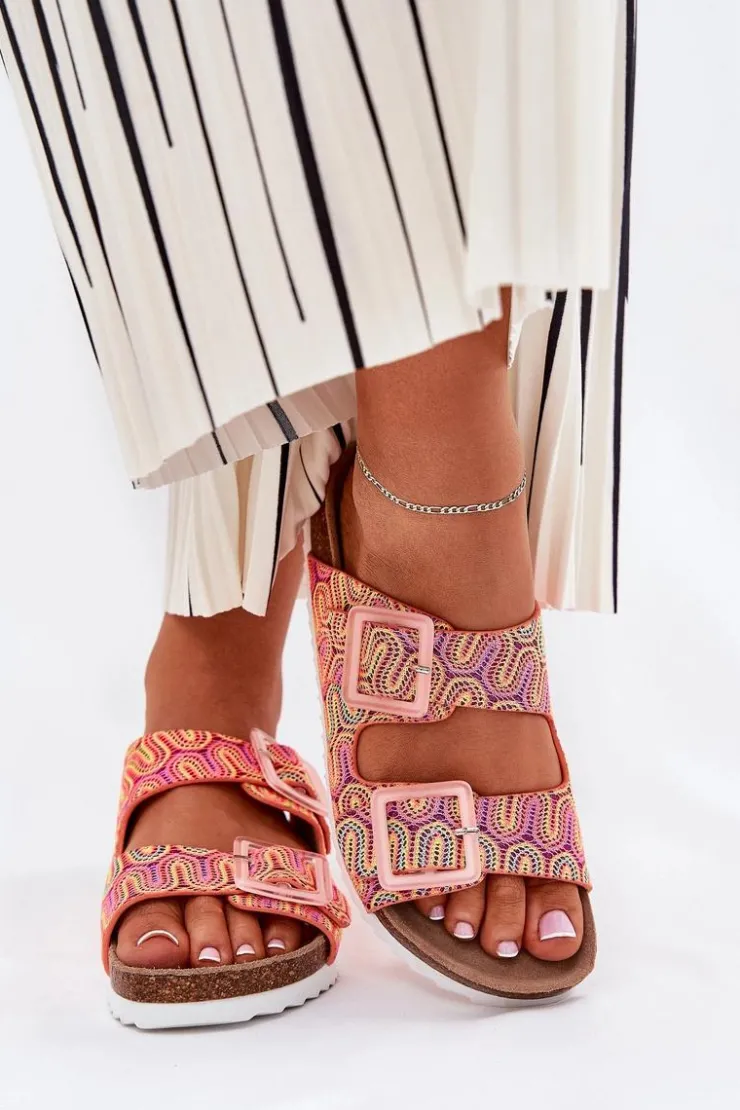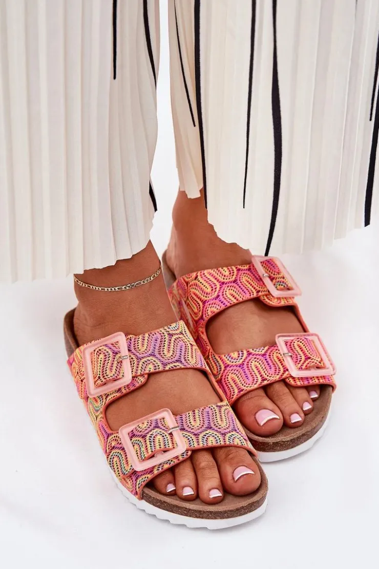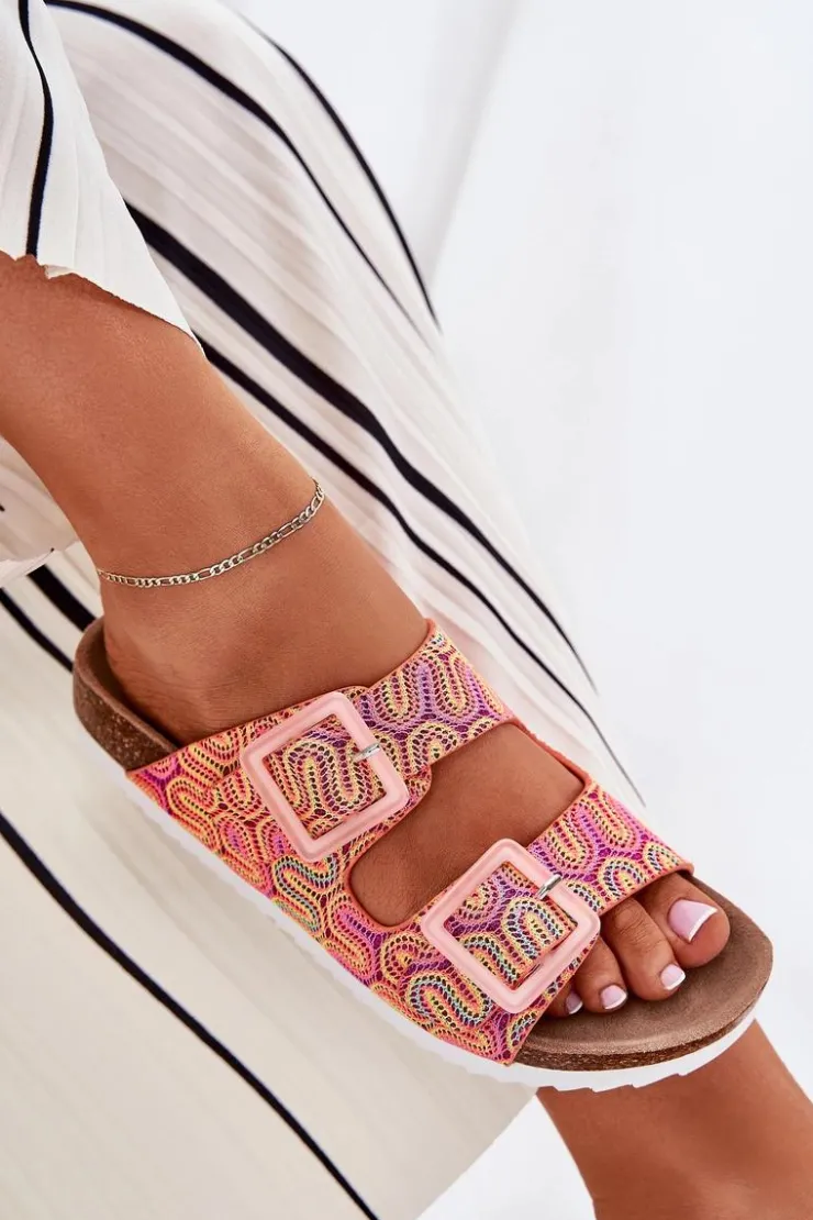 Wzorzyste klapki damskie z materiału tekstylnego, osadzone na korkowej platformie, które łączą wygodę z modnym wyglądem. Dwa paski z klamrami ozdobione brokatem dodają im wyjątkowego charakteru. Profilowana zamszowa wkładka zapewnia komfort przez cały dzień. Te klapki będą doskonałym wyborem na letnie dni, idealnie komponując się z sukienkami, spódnicami czy szortami, wprowadzając do każdej stylizacji lekkość i blask. Buty mogą nieznacznie różnić się od siebie pod względem rozmieszczenia wzoru!! Przy wyborze rozmiaru prosimy sugerować się tabelą rozmiarów.