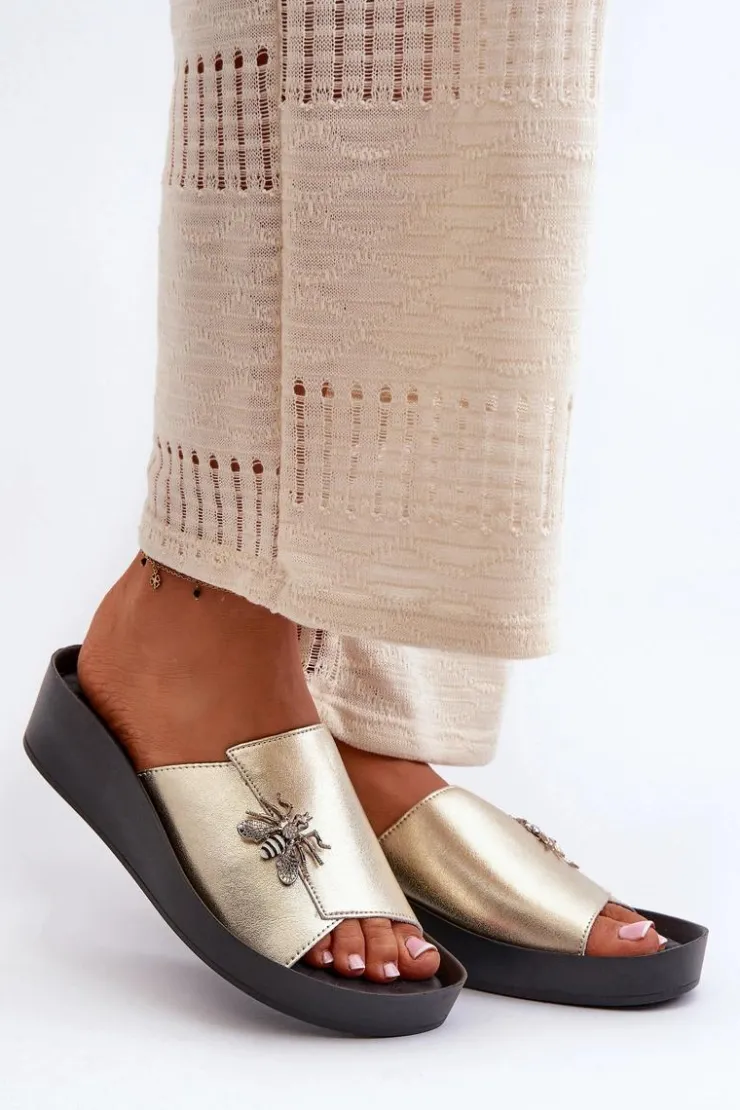 Damskie klapki wykonane z wysokiej jakości naturalnej skóry to połączenie elegancji i komfortu. Osadzone na stabilnej platformie i delikatnym koturnie. Miękka wkładka, także wykonana z naturalnej skóry, gwarantuje wygodę przez cały dzień. Urocza ozdoba umieszczona na pasku dodaje wyjątkowego uroku i stylu, czyniąc je idealnym wyborem na różne okazje, od codziennych spacerów po bardziej eleganckie wyjścia. Przy wyborze rozmiaru prosimy sugerować się tabelą rozmiarów.