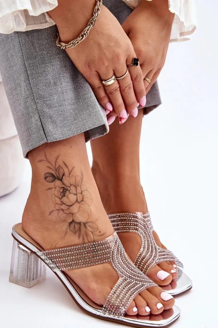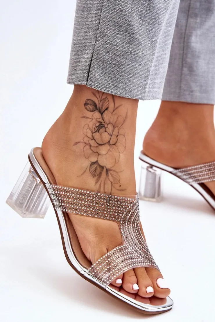 Klapki damskie zostały osadzone na obcasie w postaci słupka. Cholewka wykonana z gumowego tworzywa, która została dodatkowo ozdobiona dżetami. Model klasyczny, wsuwany, z odkrytą piętą i palcami. Buty te posiadają miękką, wykonaną z naturalnej skóry wkładkę. Stylowe, komfortowe w użytkowaniu oraz stabilne. Nie czekaj dłużej i kup już dziś! Przy wyborze rozmiaru prosimy kierować się tabelą rozmiarów.