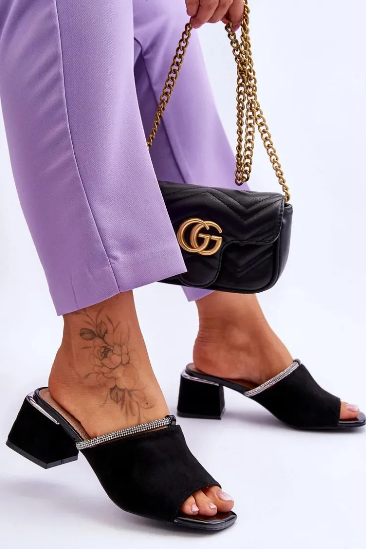 Niezwykle modne, damskie klapki z pewnością sprawdzą się w sezonie letnim w wielu sytuacjach! Zostały wykonane z miłego w dotyku eko zamszu. Klapki posiadają wykonaną z naturalnej skóry wkładkę. Dodatkowo zostały ozdobione paseczkiem z dżetami. Osadzone na obcasie w postaci klocka. Przy wyborze rozmiaru prosimy kierować się tabelą rozmiarów.