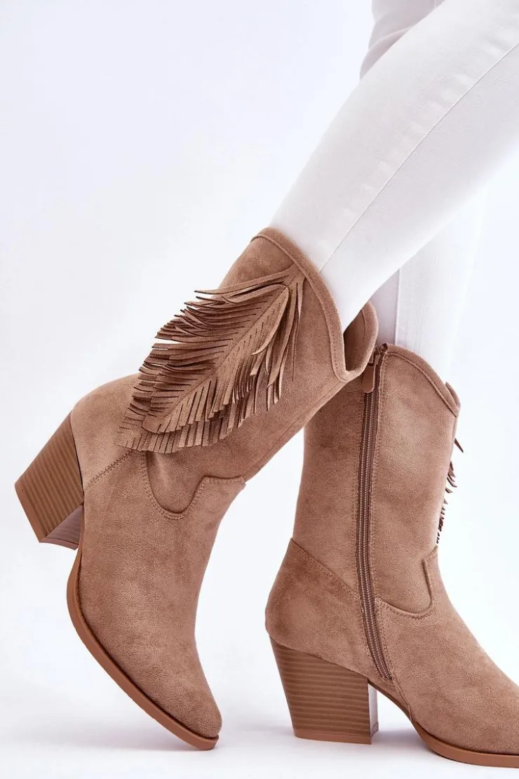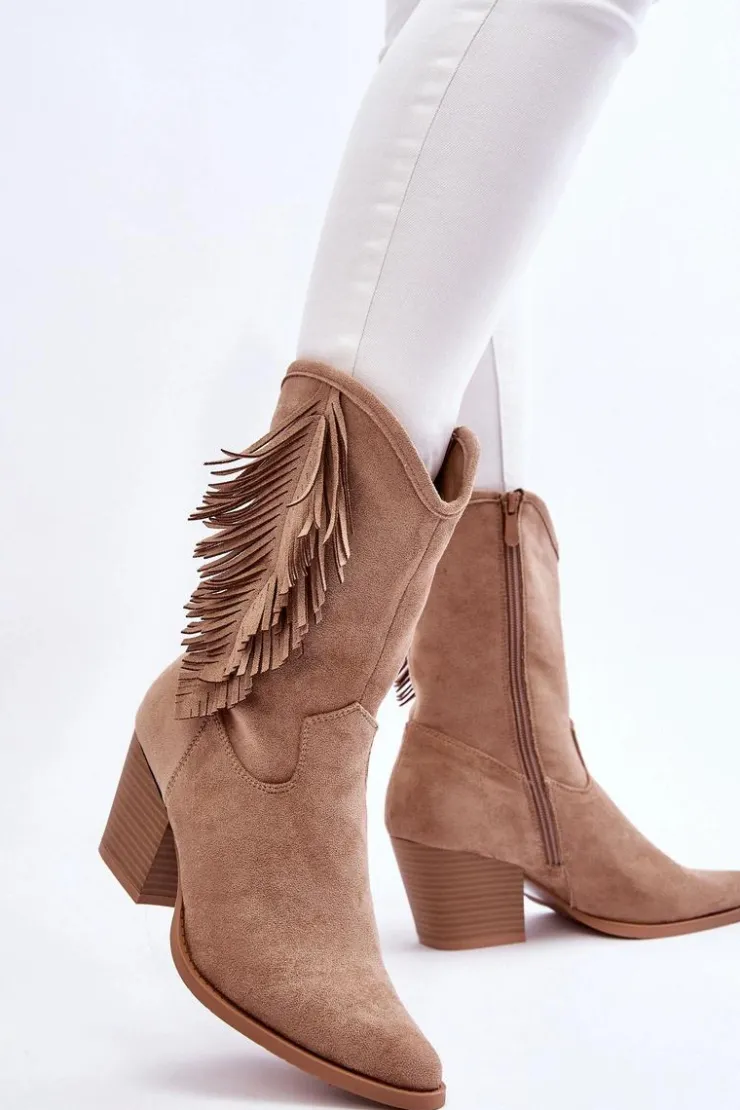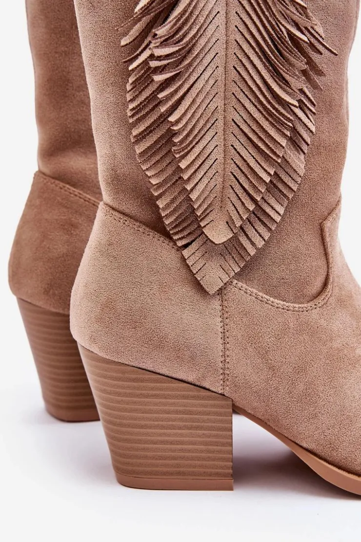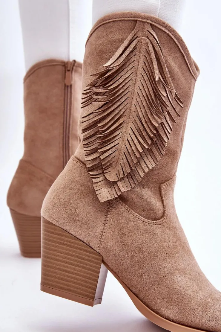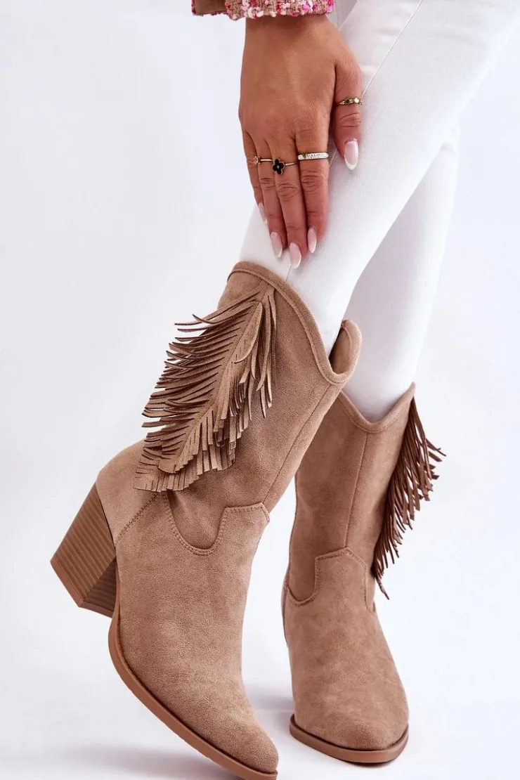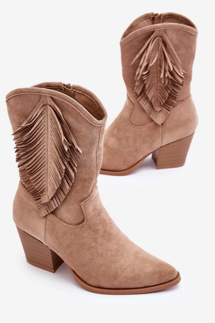 Ten model skradnie serce niejednej miłośniczce kozaków w stylu kowbojek! Świetnie sprawdzą się w wielu stylizacjach! Model ten został wykonany z miłego eko zamszu z ozdobami na cholewce. Kozaki są zapinane na suwak. Osadzone na obcasie w postaci masywnego słupka. Nosek w szpic optycznie wysmukli nogi. Kozaki te posiadają usztywniany zapiętek oraz miękką, eko skórzaną wkładkę. Przy wyborze rozmiaru prosimy sugerować się tabelą rozmiarów.
