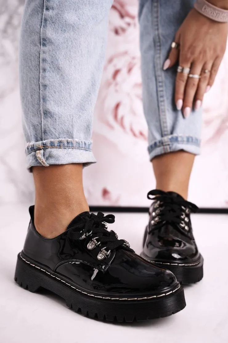 Damskie buty S.Barski Półbuty Lakierowane*Damskie Półbuty Oxfordy Na Platformie S.Barski HX15 Lakierowane Czarne
