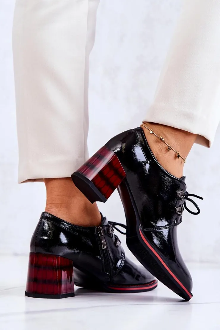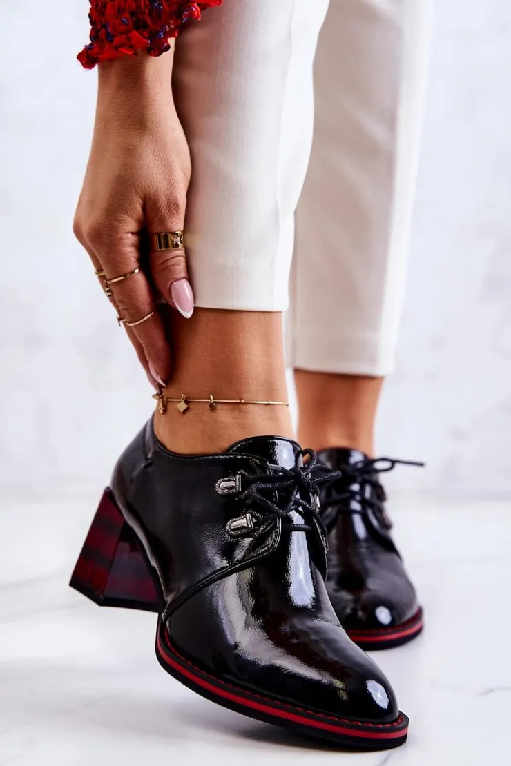 Półbuty wykonane z lakierowanej eko skóry z cholewką do kostki. Model wiązany oraz zapinany na suwak od wewnętrznej strony. Nosek w kształcie migdała. Miękka wkładka została wykonana z naturalnej skóry i jest bardzo komfortowa w użytkowaniu. Masywny obcas w postaci słupka zapewni stabilność na każdym kroku. Buty posiadają usztywniany zapiętek. Model, który wprowadzi w zachwyt niejedną miłośniczkę wyjątkowych fasonów obuwia! Przy wyborze rozmiaru prosimy sugerować się tabelą rozmiarów.