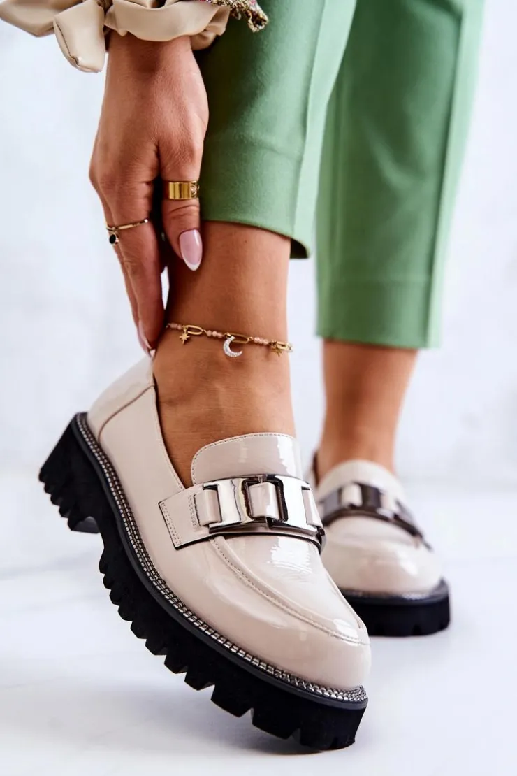 Cudne, wykonane z eko skóry półbuty w stylu loaferów! Ten fason idealnie sprawdzi się w sezonie wiosenno-jesiennym. Cholewka do kostki, z paskiem na przodzie przyozdobionym metalowym elementem. Nosek zaokrąglony. Podeszwa wykonana z tworzywa sztucznego z dużym bieżnikiem. Płaski obcas zapewni stabilność na każdym kroku. Miękka, wygodna wkładka została wykonana z naturalnej skóry. Ten model idealnie sprawdzi się zarówno w casualowych, jak i bardziej eleganckich outfitach! Przy wyborze rozmiaru prosimy sugerować się tabelą rozmiarów.