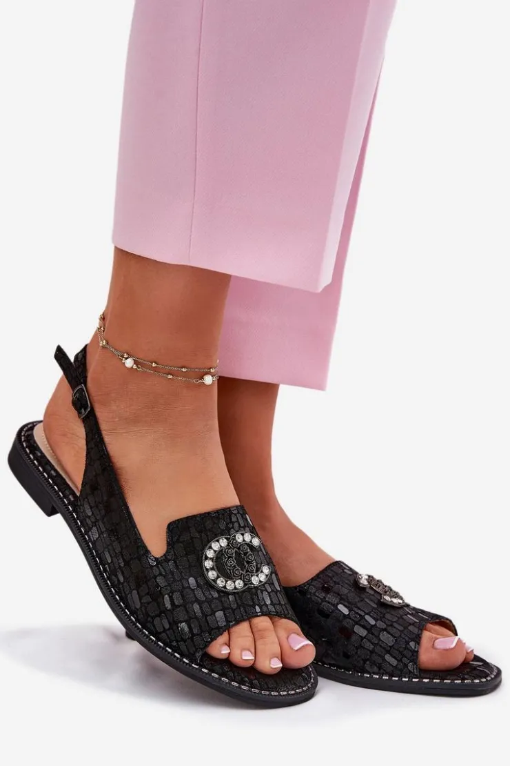 Damskie sandały wykonane z naturalnej skóry zamszowej stanowią elegancką opcję na letnie dni. Osadzone na płaskim obcasie, oferują komfort i wygodę przez cały dzień. Zapięcie na sprzączkę umożliwia idealne dopasowanie do stopy. Przód ozdobiony jest subtelnym detalem, co nadaje im unikalny charakter. Skórzana wkładka zapewnia dodatkowy komfort, co czyni te sandały idealnym wyborem na eleganckie letnie stylizacje. Przy wyborze rozmiaru prosimy kierować się tabelą rozmiarów.