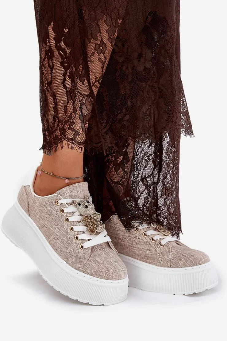 Sneakersy damskie wykonane z materiału tekstylnego. Osadzone na masywnej platformie. Z przodu na sznurowaniu znajduje się urocza przypinka w kształcie misia, która dodaje wyjątkowego charakteru. Miękka wkładka zapewnia komfort przez cały dzień, dbając o odpowiednią amortyzację. Idealne na co dzień, te sneakersy doskonale pasują do wielu stylizacji, wprowadzając do nich stylowy akcent. Przy wyborze rozmiaru prosimy sugerować się tabelą rozmiarów.