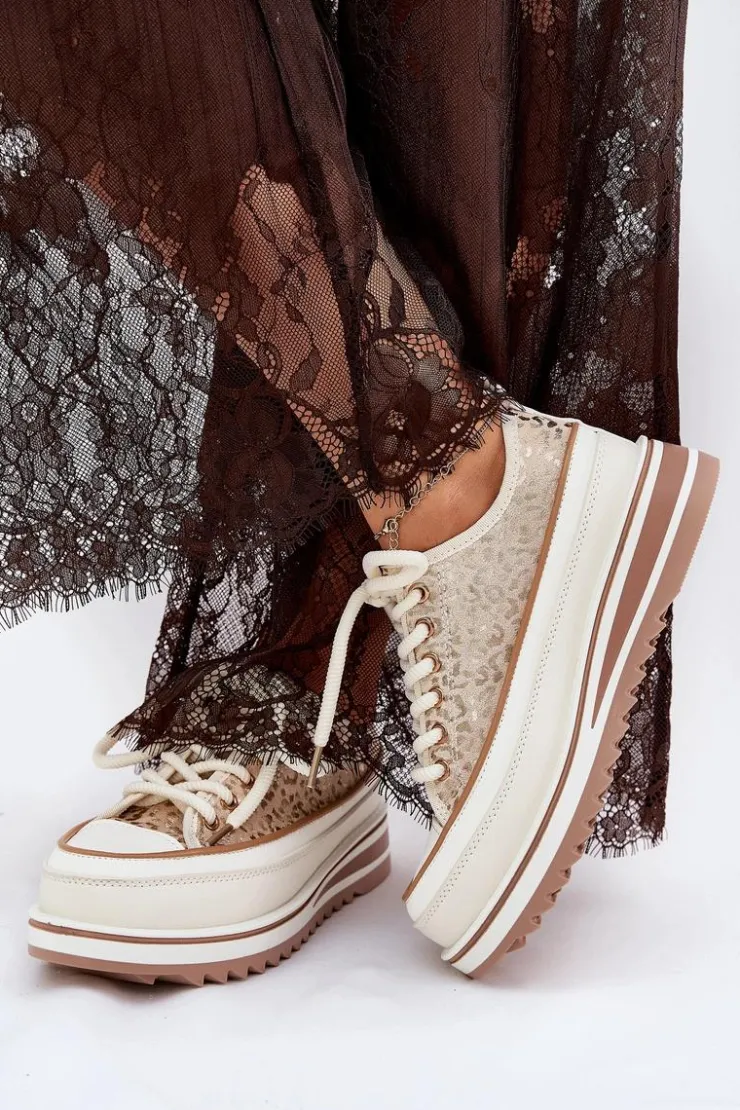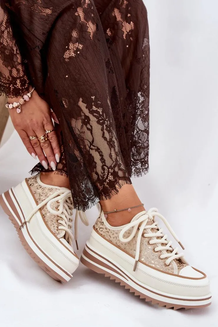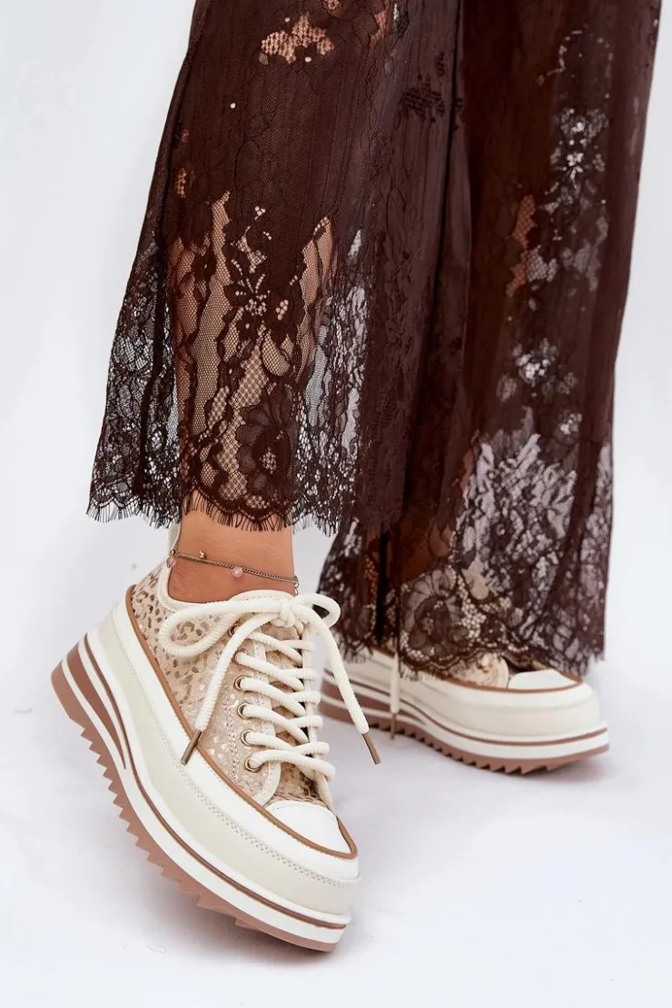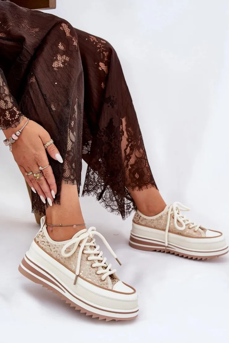 Trampki damskie wykonane z materiału tekstylnego. Osadzone na masywnej platformie, która wysmukli sylwetkę. Model z grubszym sznurowaniem, co dodaje im wyjątkowego charakteru. Miękka wkładka zapewnia komfort i amortyzację na każdym kroku. Doskonałe do codziennych stylizacji, te trampki oferują zarówno styl, jak i funkcjonalność. Przy wyborze rozmiaru prosimy sugerować się tabelą rozmiarów.
