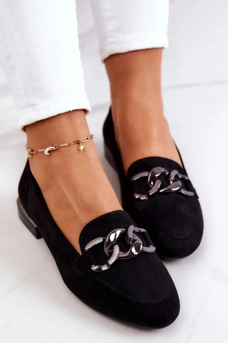Eleganckie i stylowe mokasyny świetnie sprawdzą się podczas wielu stylizacji! Mokasyny wykonane z eko zamszu. Wsuwane, z migdałowym, smukłym noskiem. Osadzone na płaskim obcasie. Utrzymane w jednolitej kolorystyce. Przód ozdobiony pięknym łańcuszkiem. Dodatkowo mokasyny posiadają wkładkę ze skóry naturalnej. Idealne do codziennych stylizacji! Przy wyborze rozmiaru prosimy sugerować się tabelą rozmiarów.