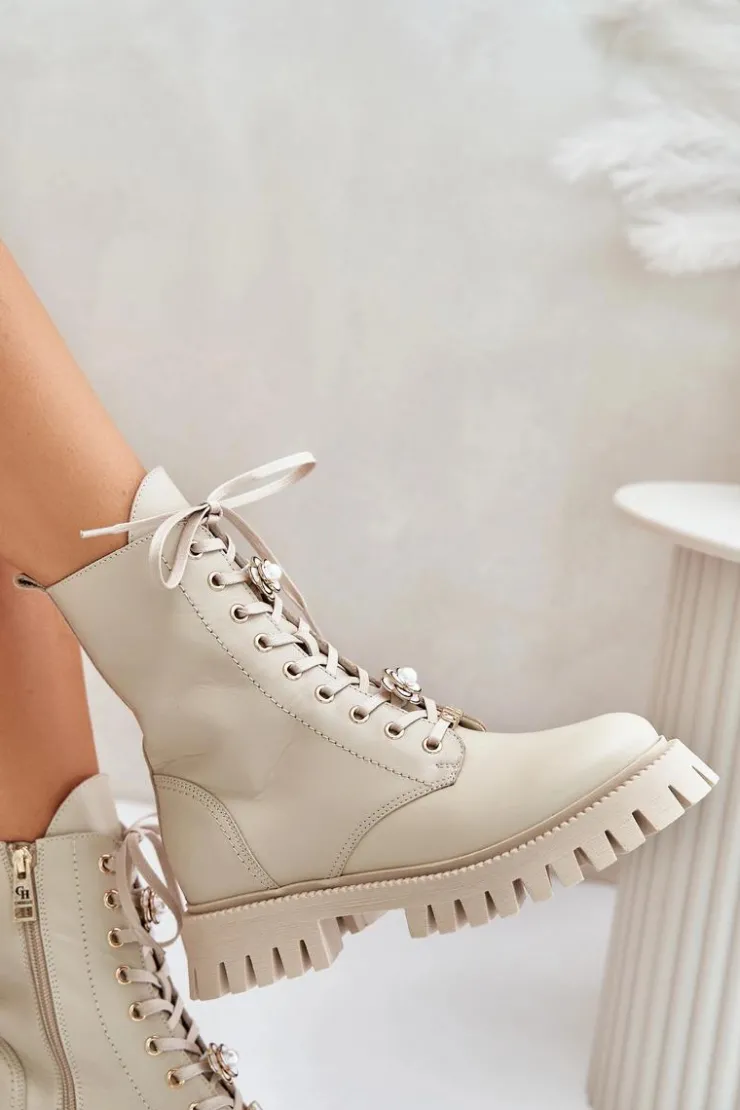 Śliczne botki wykonane z naturalnej skóry to stylowy wybór na każdą okazję. Osadzone na płaskim obcasie, zapewniają wygodę przez cały dzień. Model posiada zarówno sznurowanie, jak i zamek, co ułatwia dopasowanie oraz szybkie zakładanie. Dodatkową ozdobą są urocze przypinki na sznurowaniu. Idealne dla osób ceniących komfort i oryginalny styl w jednym. Przy wyborze rozmiaru prosimy sugerować się tabelą rozmiarów.