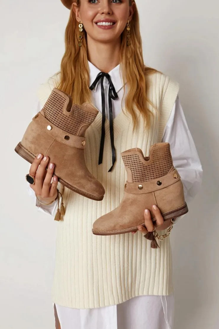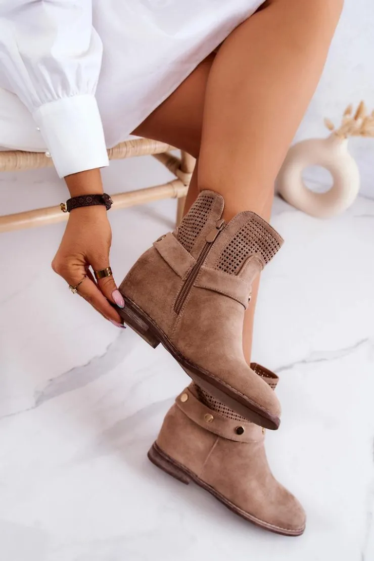 Cudowne ażurowe botki na ukrytym koturnie i płaskim obcasie. Posiadają cholewką za kostkę z wycięciami po bokach oraz perforacją. Klasycznie zamykane na suwak, z zaokrąglonym noskiem. Wykonane z wysokiego jakościowo eko zamszu. Miękka wkładka z eko skóry pozwala na wygodne użytkowanie w ciągu dnia. To model, który sprawdzi się podczas wielu sezonów!Przy wyborze rozmiaru prosimy sugerować się tabelą rozmiarów.