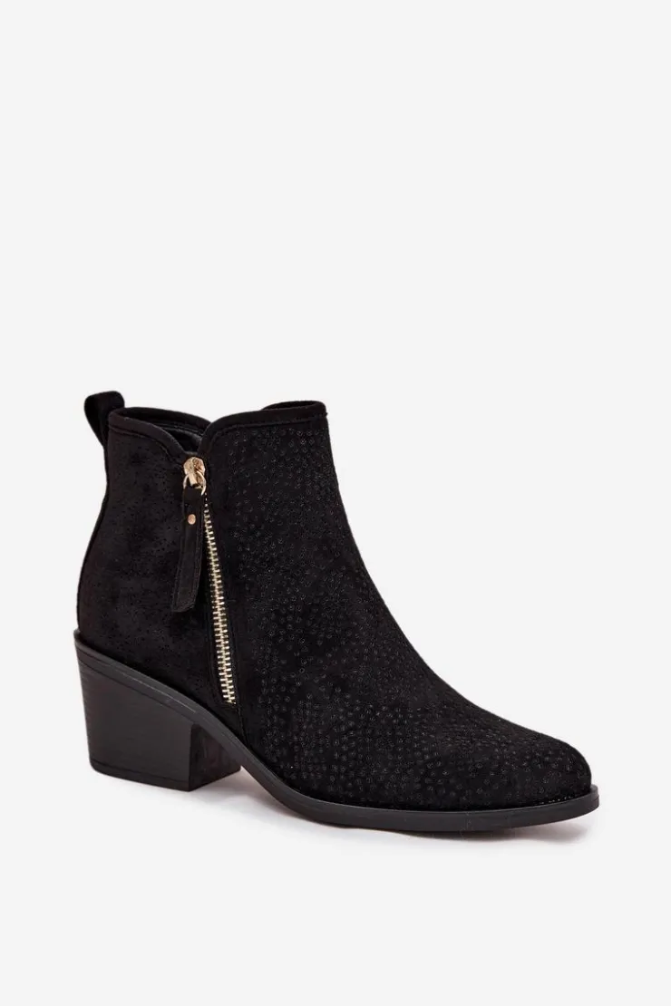 Botki damskie w stylu kowbojek od marki S.Barski. Wykonane z wysokiej jakości materiałów, prezentują się elegancko i przyciągają wzrok detalami. Model został osadzony na stabilnym, ściętym obcasie typu słupek, który zapewnia komfort i wygodę podczas chodzenia, a jednocześnie subtelnie wysmukla sylwetkę. Migdałowe noski nadają butom kobiecego charakteru, podkreślając zgrabną linię stopy. Botki posiadają praktyczne zapięcie na zamek, które ułatwia ich zakładanie i zdejmowanie, a dodatkowy, ozdobny zamek pełni funkcję stylowego detalu, nadając całemu modelowi nowoczesnego i oryginalnego wyglądu. To idealne obuwie do casualowych stylizacji, jak i do outfitów inspirowanych modą boho.