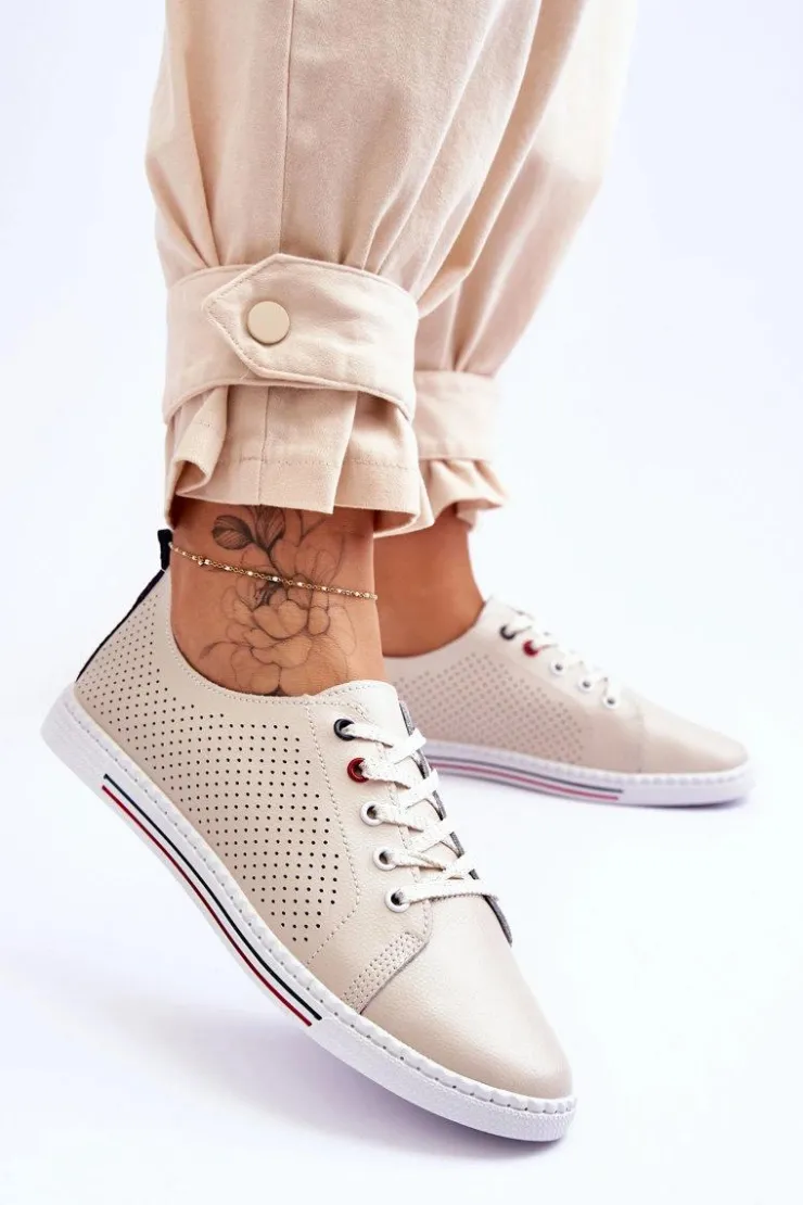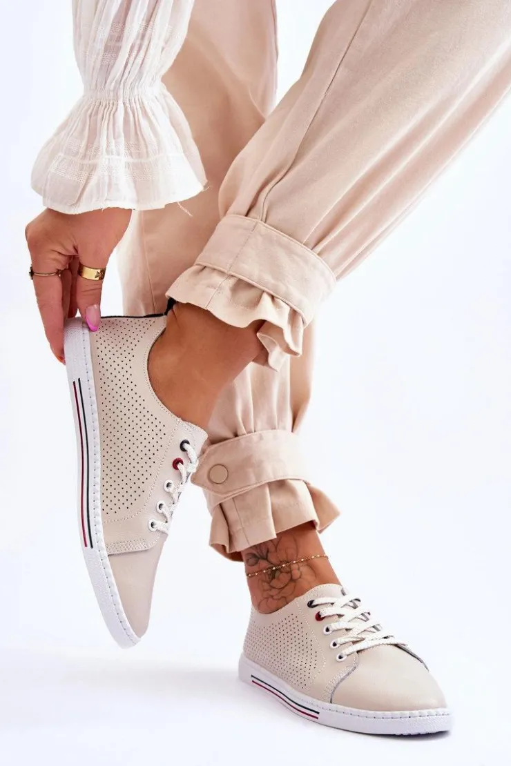 Niskie trampki damskie zostały wykonane z naturalnej skóry. Ażurowa cholewka świetnie sprawdzi się w cieplejsze dni, gdyż zapewnia odpowiednią wentylację obuwia. Model posiada sznurowadła z ozdobną nicią. Tenisówki osadzono na niskiej platformie z gumową, antypoślizgową podeszwą. Wkładka Comfort została wykonana także z naturalnej skóry. Przy wyborze rozmiaru prosimy sugerować się tabelą rozmiarów.