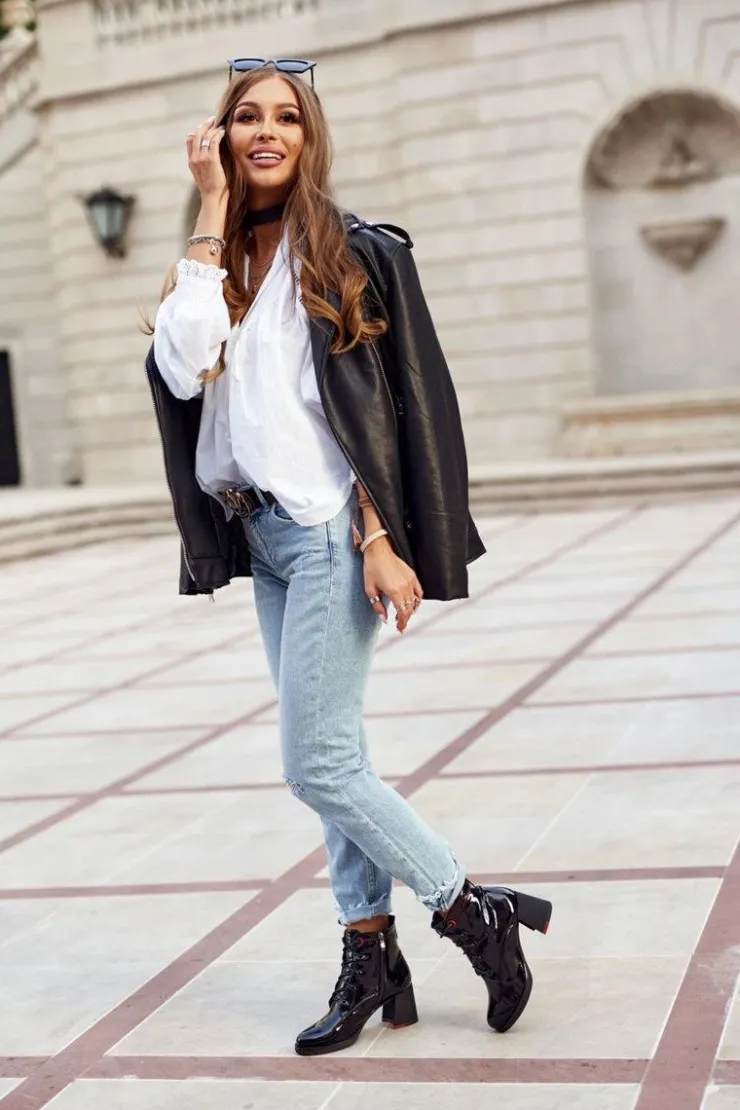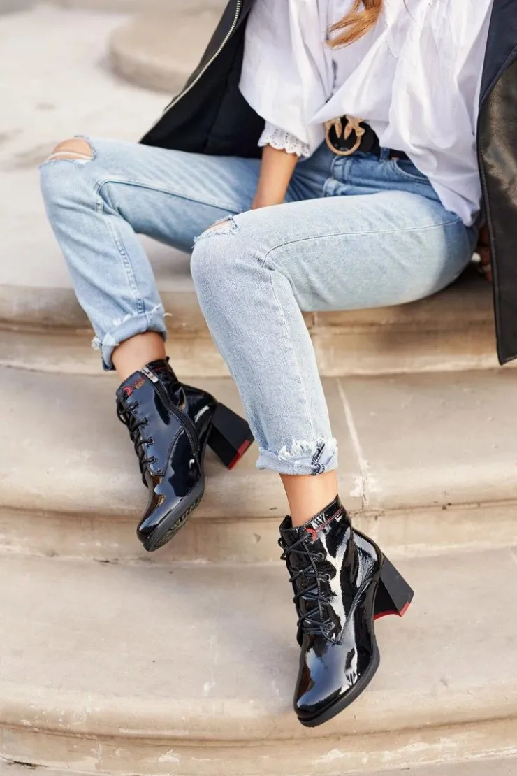 Marzyłaś o kolejnej parze butów, która zachwyci wszystkich dookoła? Jeśli tak to nie musisz już szukać dalej. Klasyczny krój na słupku nigdy nie wyjdzie z mody, a połączenie go z lakierowaną skórą ekologiczną to po prostu strzał w 10! Botki posiadają zamek błyskawiczny ułatwiający zakładanie oraz klasyczne sznurowanie dla jeszcze lepszego dopasowania. W chłodnie dni nie musisz się martwić co założyć, ponieważ botki wewnątrz posiadają delikatne ocieplenie w postaci koca obuwniczego. Przy wyborze rozmiaru prosimy sugerować się tabelą rozmiarów.