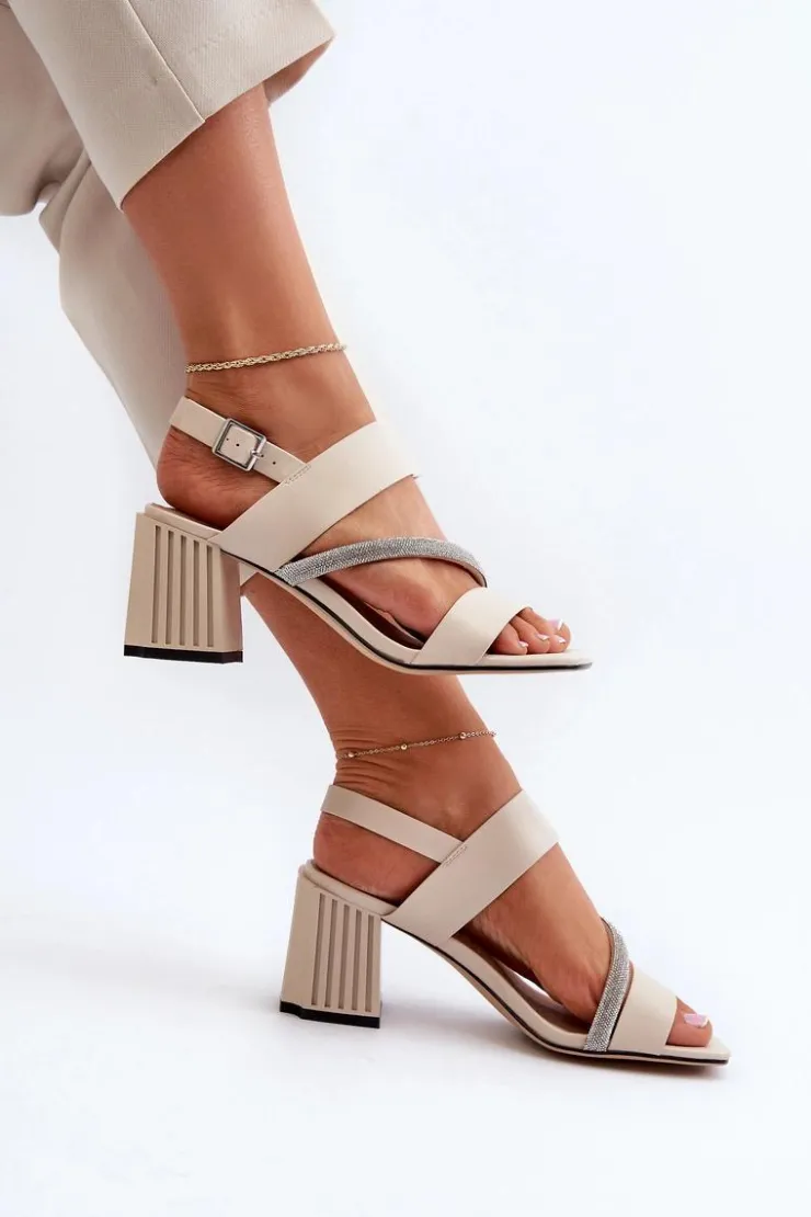 Eleganckie sandały damskie wykonane z eko skóry. Osadzone na obcasie w postaci słupka. Dodatkowy urok dodaje im ozdobny paseczek zdobiony licznymi małymi cyrkoniami, które przyciągają uwagę i nadają butom wyjątkowego blasku. To idealne obuwie na specjalne okazje i wieczorne wyjścia, które podkreśli Twój indywidualny styl. Przy wyborze rozmiaru prosimy sugerować się tabelą rozmiarów.