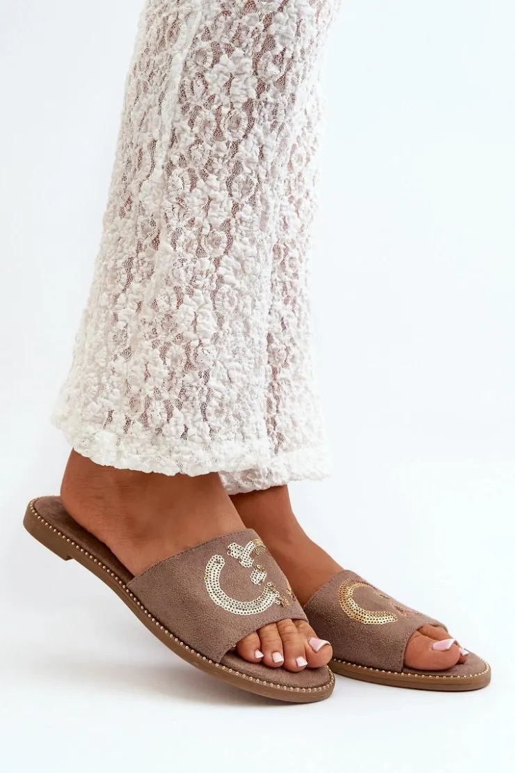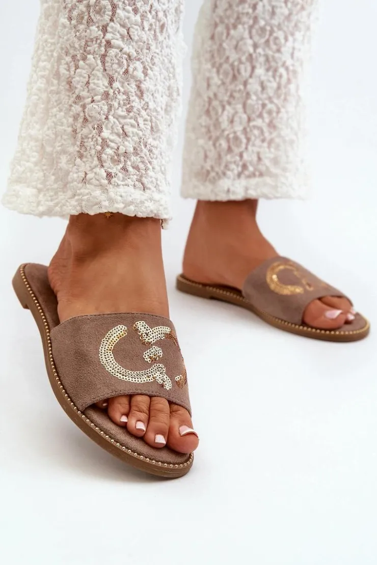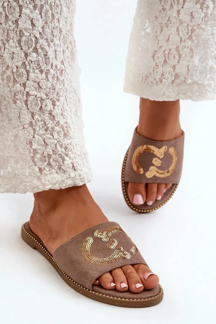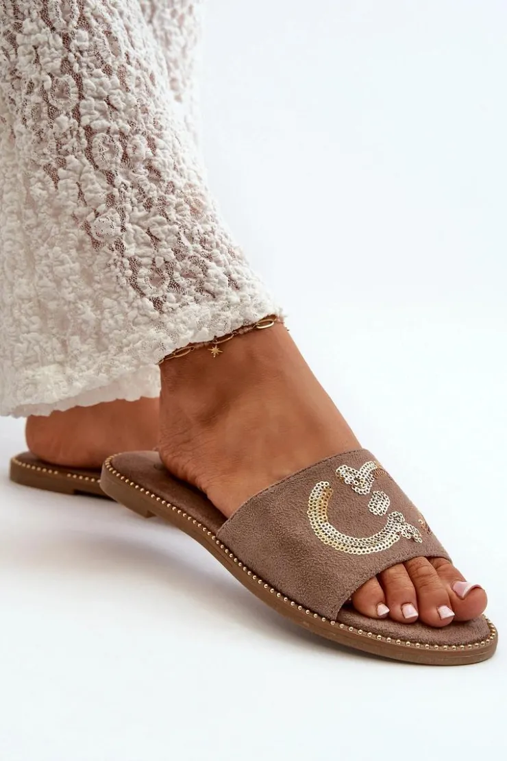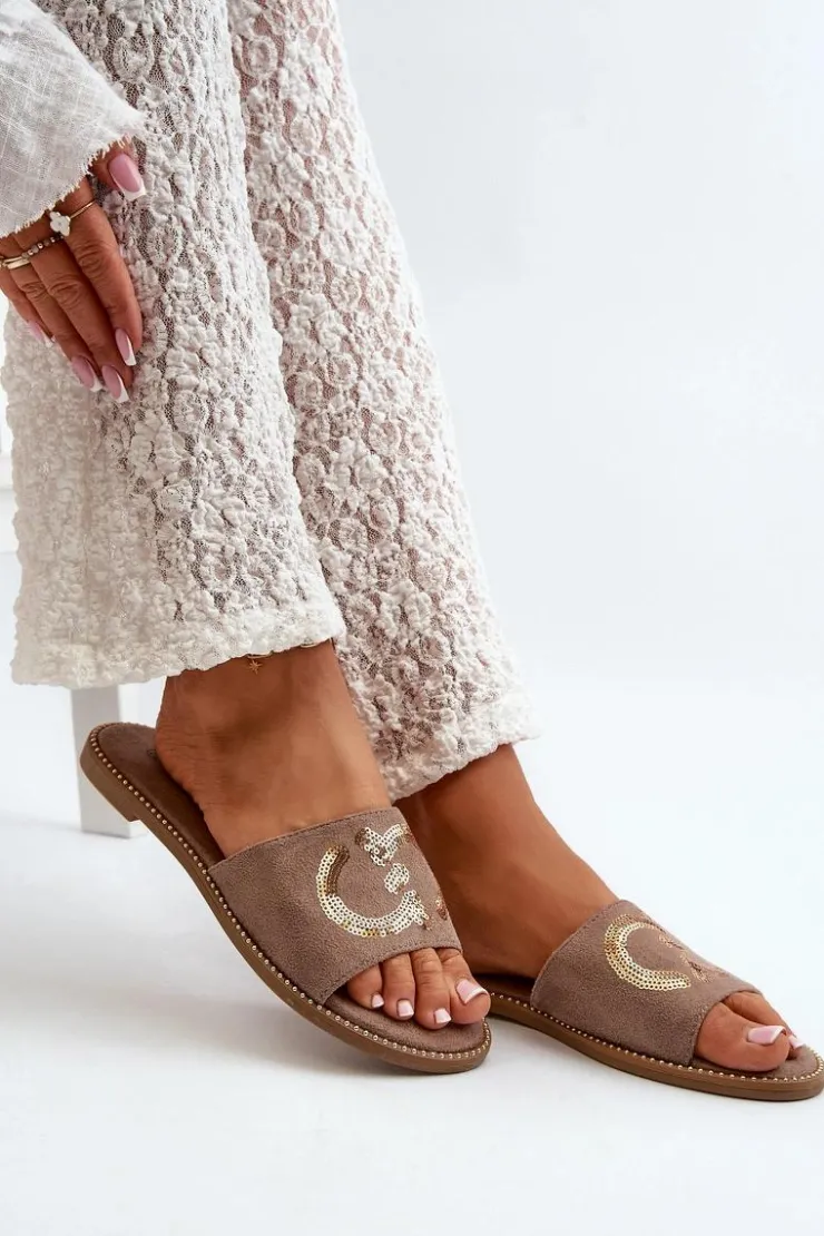 Damskie klapki zostały wykonane z eko zamszu. Osadzone na płaskim obcasie. Ozdobne cekiny na pasku dodają uoku. Miękka wkładka Comfort pozwoli na wygodne użytkowanie obuwia nawet przez cały dzień. Idealne do casualowych stylizacji! Przy wyborze rozmiaru prosimy sugerować się tabelą rozmiarów.