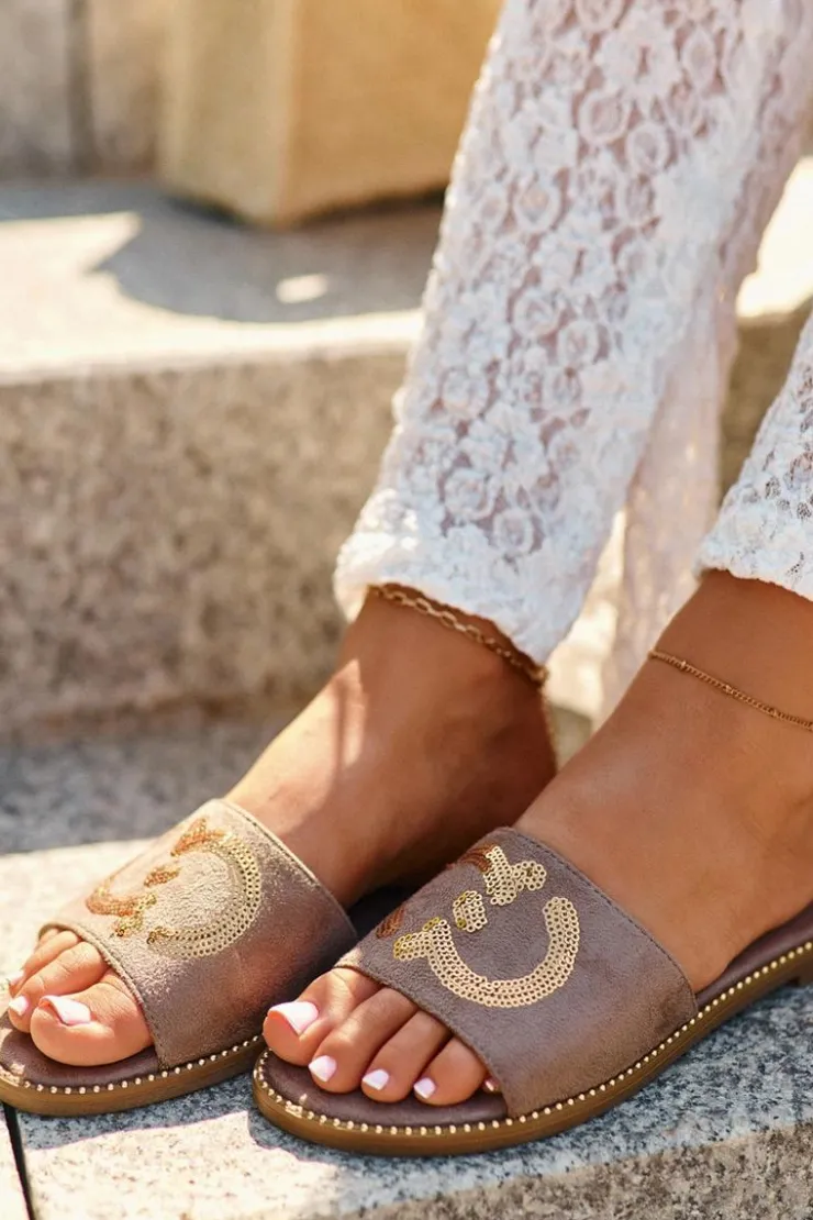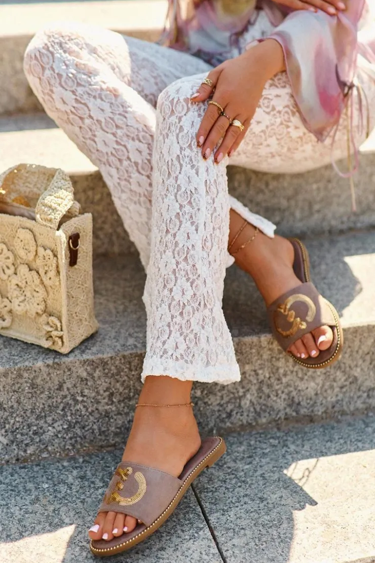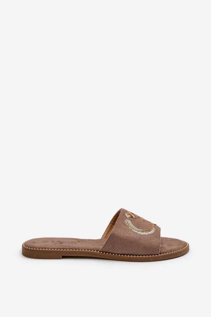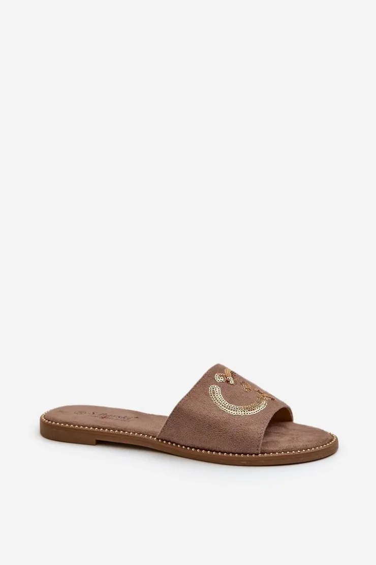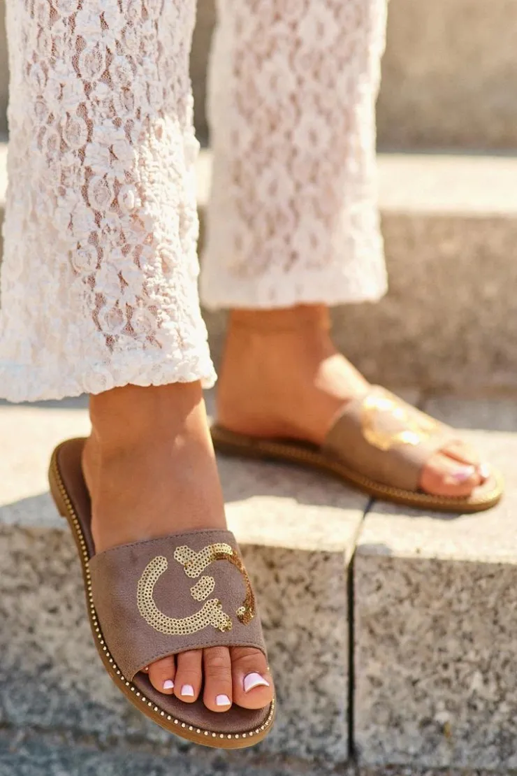 Damskie klapki zostały wykonane z eko zamszu. Osadzone na płaskim obcasie. Ozdobne cekiny na pasku dodają uoku. Miękka wkładka Comfort pozwoli na wygodne użytkowanie obuwia nawet przez cały dzień. Idealne do casualowych stylizacji! Przy wyborze rozmiaru prosimy sugerować się tabelą rozmiarów.