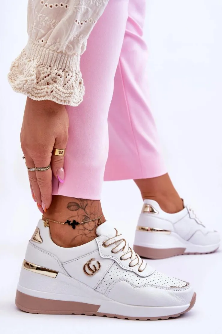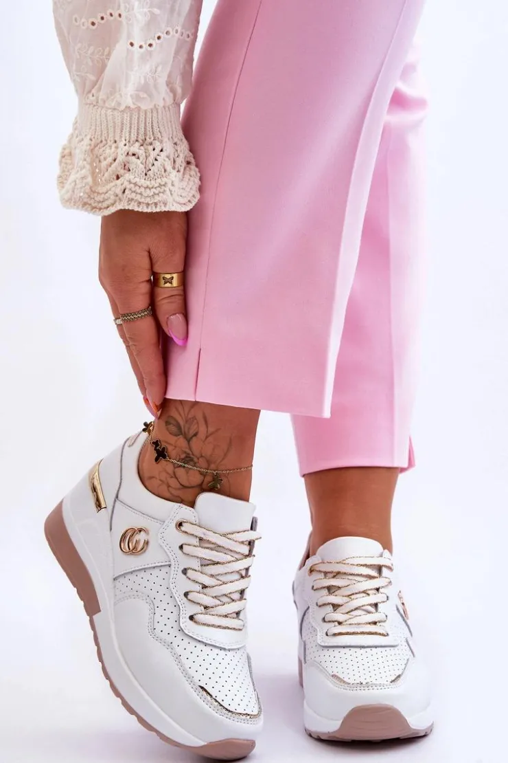 Damskie Damskie buty S.Barski Damskie Skórzane Buty Sportowe Na Koturnie Biało-Złote Rebeca
