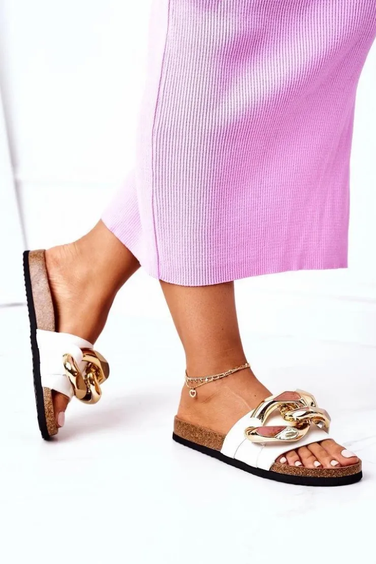 Damskie Damskie buty S.Barski Klapki Na Korku Z Łańcuchem S.Barski SB002 Białe