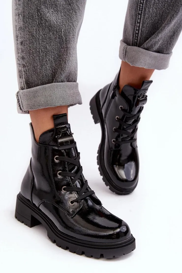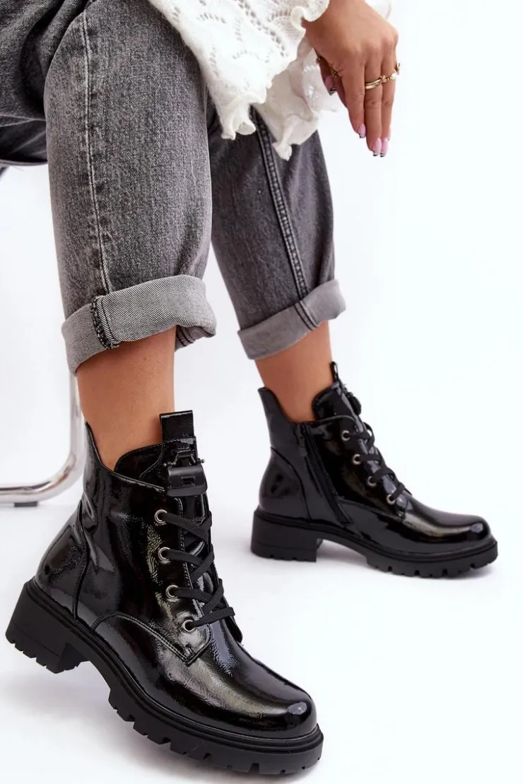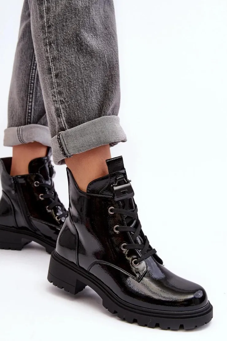 Botki damskie zostały wykonane z wysokiej jakości eko skóry. Osadzone na płaskim obcasie z bieżnikiem. Model z klasycznym sznurowaniem oraz suwakiem z boku cholewki. Noski zaokrąglone. Botki posiadają ozdobę na języku. Środek ocieplony kocem obuwniczym. Dodatkowo zapiętek jest usztywniany. Przy wyborze rozmiaru prosimy sugerować się tabelą rozmiarów.