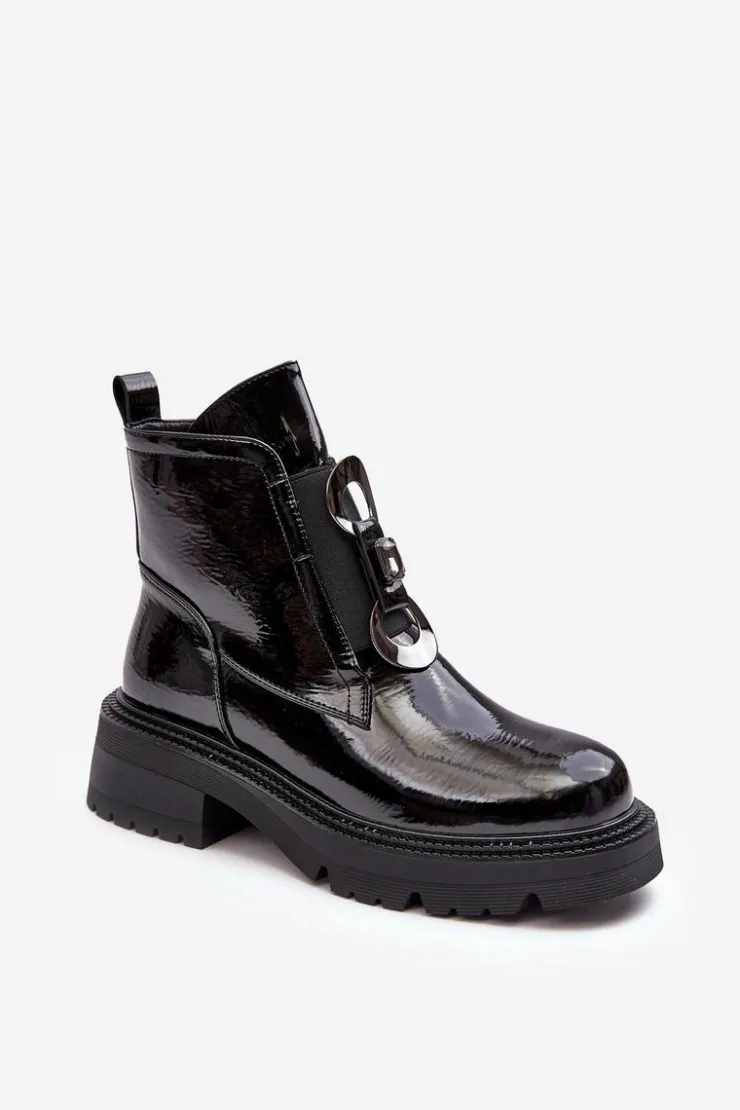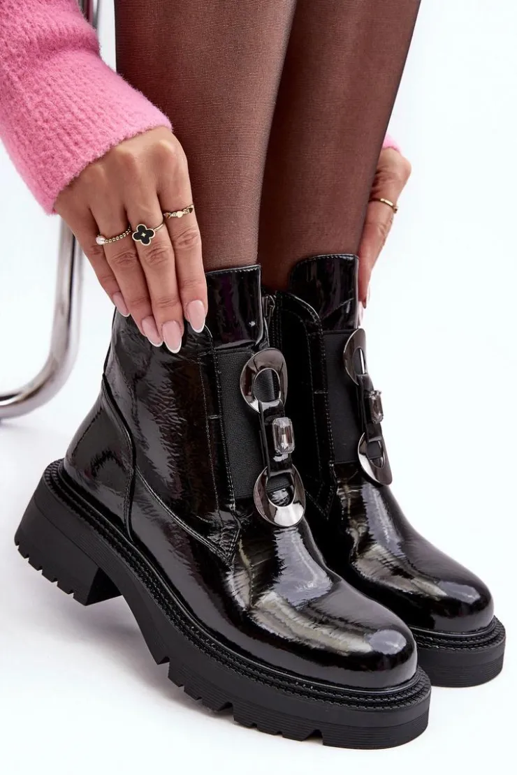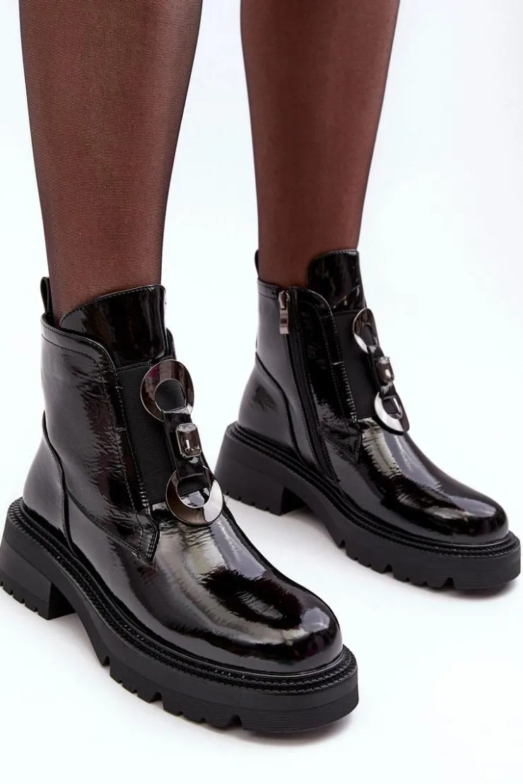Botki damskie marki S.Barski osadzone na płaskim masywnym obcasie i platformie. Wykonane z eko skóry. Model zapinany na suwak z boku. Na cholewce elastyczna wstawka i ozdoba z tworzywa sztucznego. Noski zaokrąglone. Środek ocieplony kocem obuwniczym. Usztywniony zapiętek. Przy wyborze rozmiaru prosimy sugerować się tabelą rozmiarów.