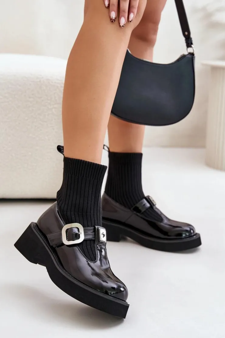 Lakierowane botki damskie osadzone na niskim, szerokim obcasie i platformie. Cholewka w formie skarpety, dodatkowo zdobiona stylowym paskiem z klamrą, nadaje im nowoczesny charakter. Środek ocieplony kocem obuwniczym wyłącznie na wysokości stopy. Idealne do miejskich stylizacji, łączą wygodę z modnym wyglądem. Przy wyborze rozmiaru prosimy sugerować się tabelą rozmiarów.