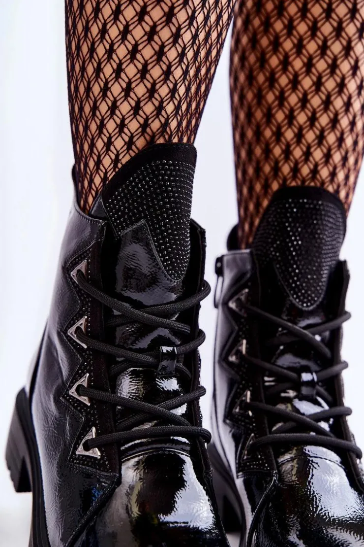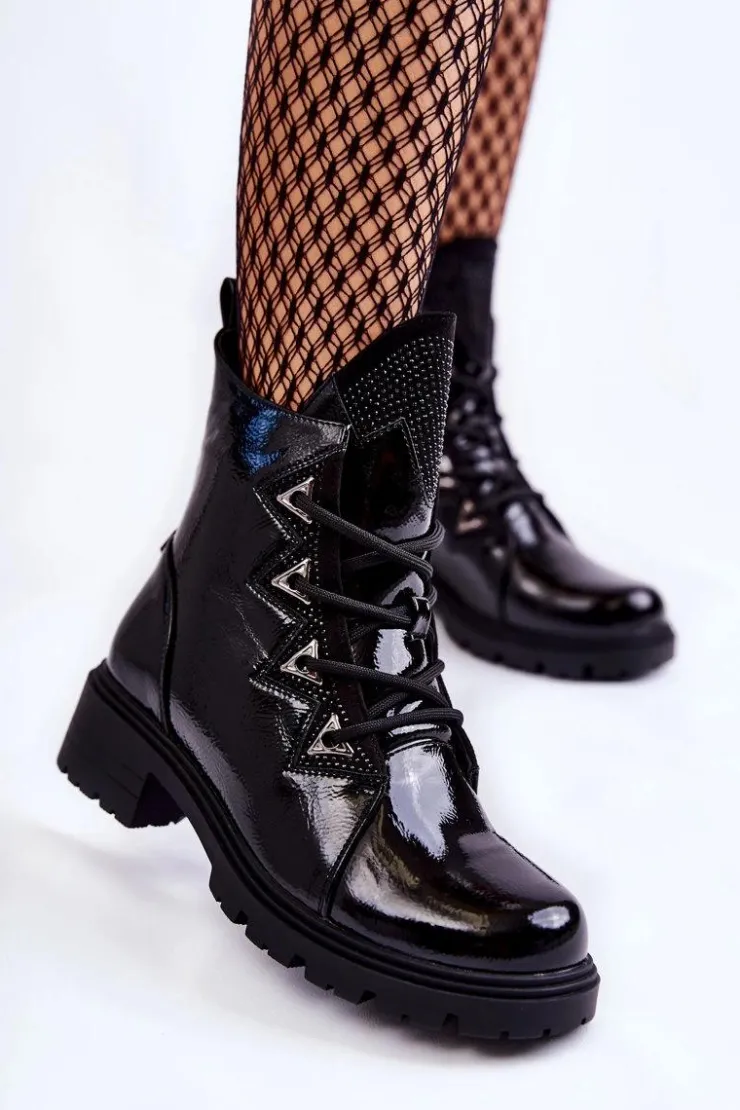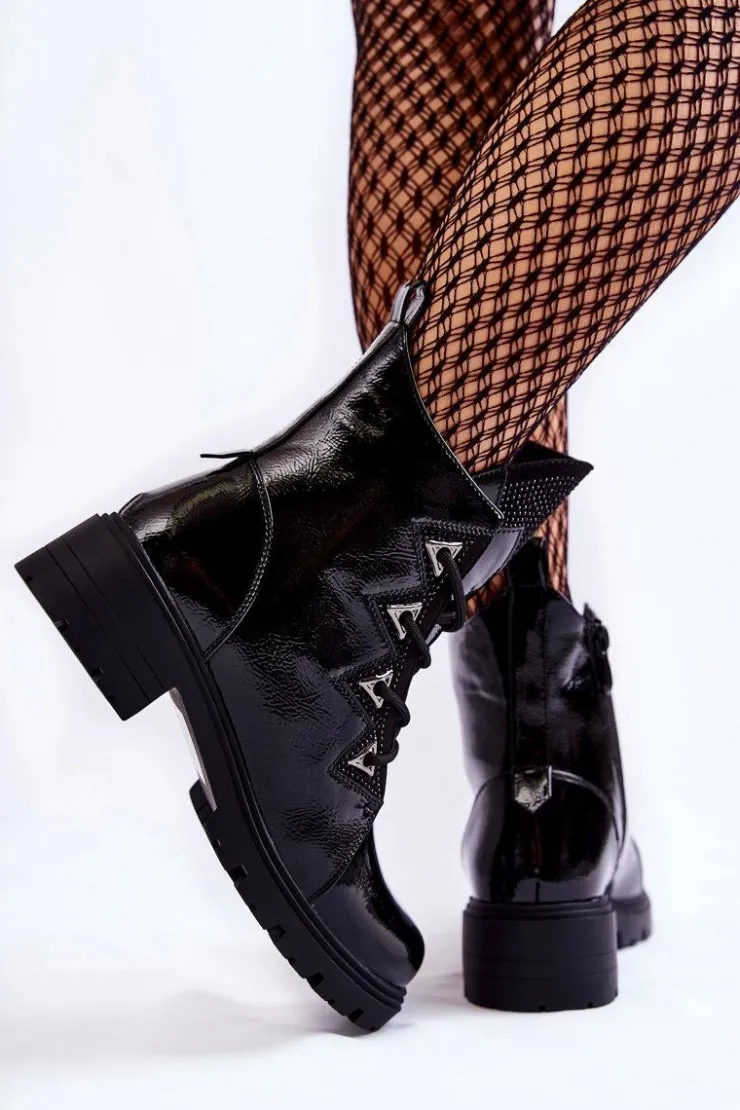 Botki damskie to idealny wybór na przejściowy sezon. Te botki zostały wykonane z lakierowanej eko skóry. Posiadają dżety przy sznurowadłach i na języku. Dodatkowo zapiętek jest usztywniany. Model ten posiada ocieplenie w postaci koca obuwniczego. Botki osadzone na płaskim obcasie i platformie ze żłobieniami. Ten model powinien być Twój! Przy wyborze rozmiaru prosimy sugerować się tabelą rozmiarów.