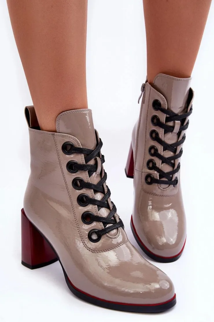 Botki marki S.Barski osadzone na obcasie w postaci słupka. Wykonane z eko skóry. Model zapinany na suwak po wewnętrznej stronie cholewki oraz dodatkowo posiada sznurowanie. Wnętrze ocieplone kocem obuwniczym. Zaokrąglone noski. Przy wyborze rozmiaru prosimy sugerować się tabelą rozmiarów.