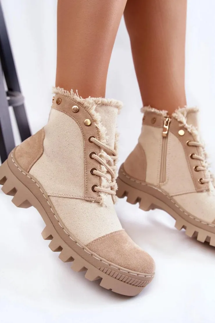 Trapery idealne do wielu stylizacji? – Tak to możliwe! Wykorzystaj je do jeansów, joggerów, dzianinowych sukienek czy długich koszuli! Połącz je z wybraną stylizacją i zachwyć wszystkich swoim look’iem! Botki zostały wykonane z połączenia eko zamszu oraz materiału tekstylnego. Posiadają klasyczne wiązanie oraz suwak ułatwiający zakładanie obuwia. Postrzępione nitki oraz gładkie dżety ozdabiają górę cholewki. Wkładka wykonana z eko skóry. Przy wyborze rozmiaru prosimy sugerować się tabelą rozmiarów.