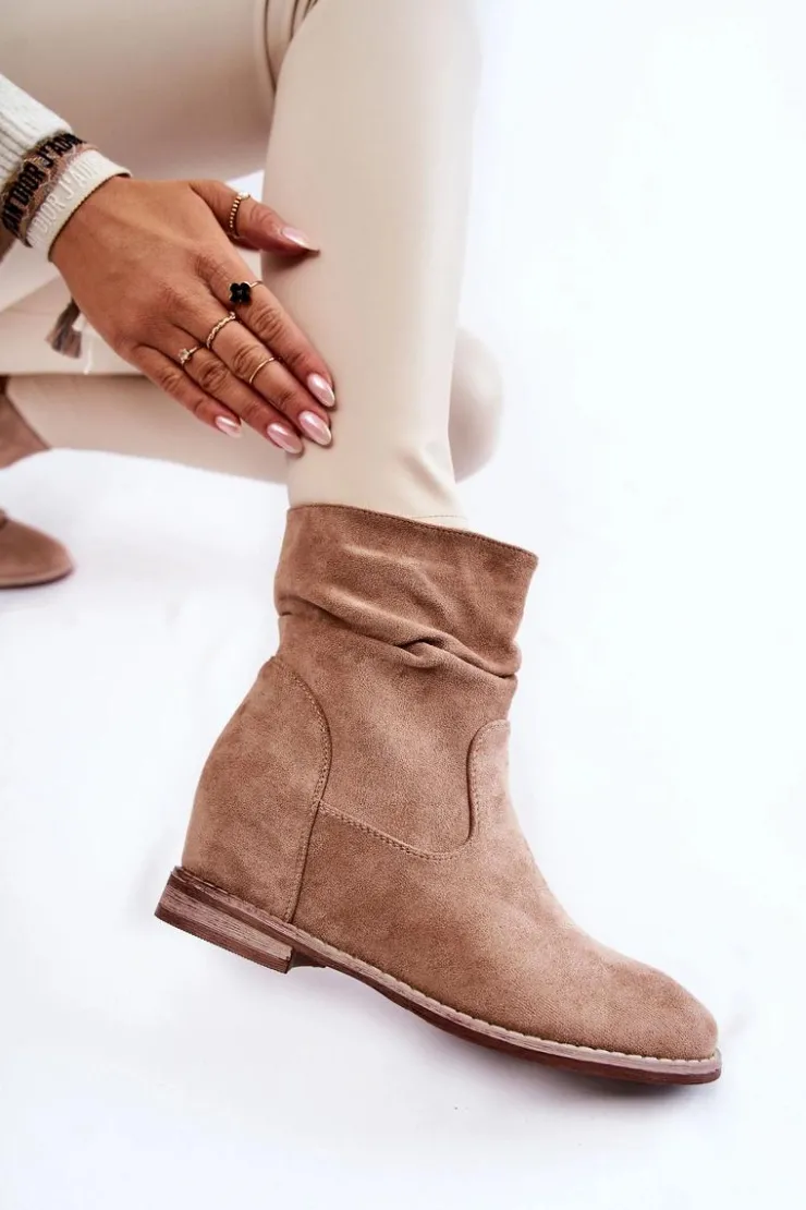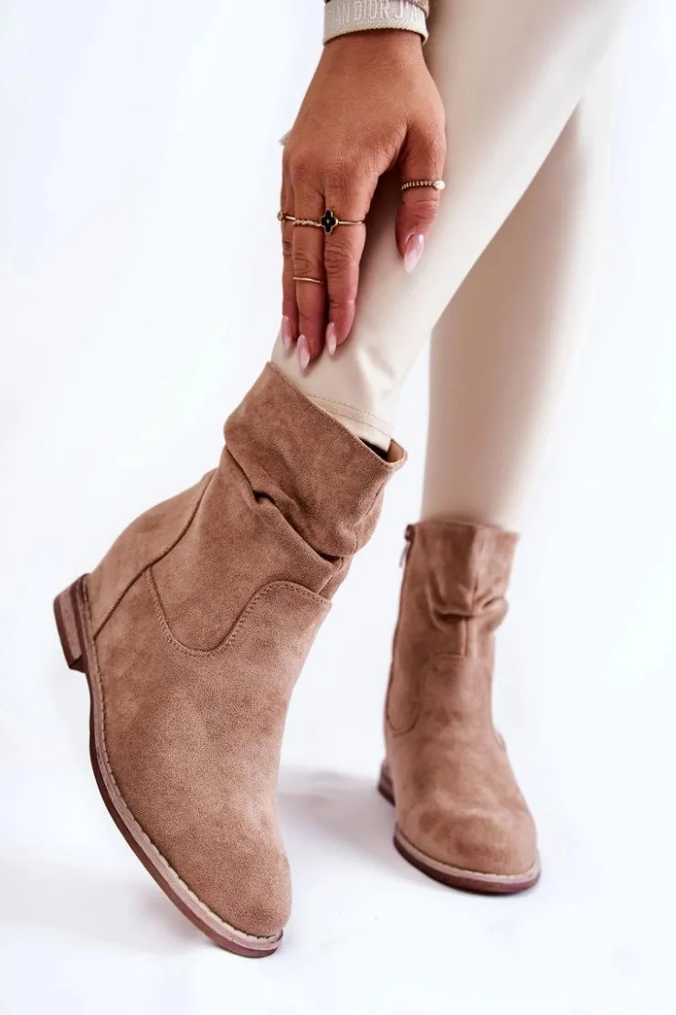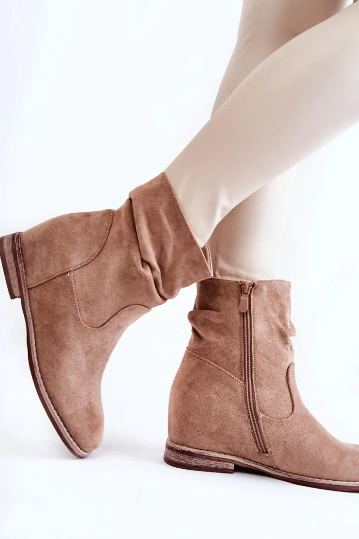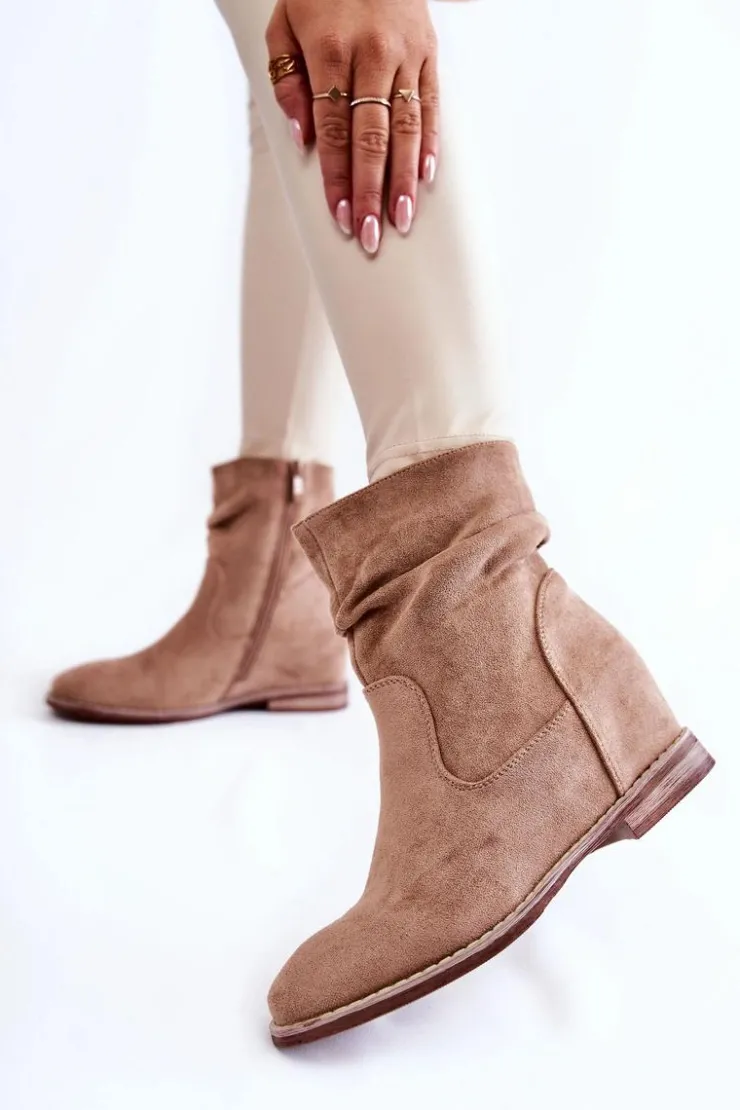 Modne botki na ukrytym koturnie i płaskim obcasie posiadają cholewką za kostkę, która jest delikatnie marszczona u góry. Model zapinany z boku na suwak. Botki zostały wykonane z eko zamszu. Miękka wkładka z eko skóry pozwala na wygodne użytkowanie. Zapiętek jest usztywniany. Idealne na sezon wiosenno-jesienny. Przy wyborze rozmiaru prosimy sugerować się tabelą rozmiarów.