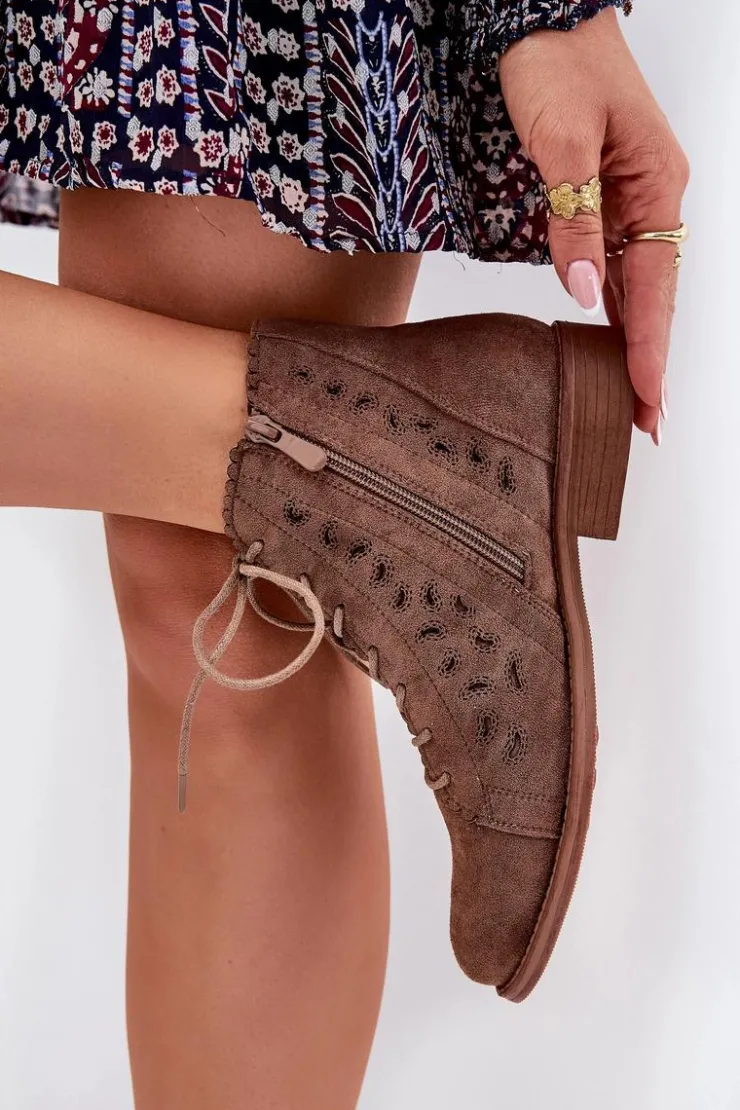 Botki damskie z eko zamszu to stylowa propozycja na chłodniejsze dni. Niska cholewka ozdobiona ażurowym wzorem nadaje im lekkości. Sznurowane i zapinane na zamek, co zapewnia łatwość zakładania oraz dopasowanie do stopy. Te botki będą doskonałym wyborem do codziennych stylizacji, łącząc funkcjonalność z modnym wyglądem.Przy wyborze rozmiaru prosimy sugerować się poniższą tabelą rozmiarów.