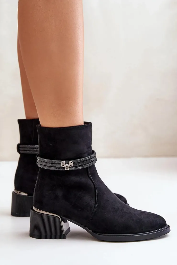 Botki damskie wykonane z wysokiej jakości eko zamszu. Osadzone na niskim obcasie. Noski w migdał. Środek ocieplany kocem obuwniczym. Zapinane na zamek. Głównym atutem tego modelu są błyszczące paseczki na cholewce. Przy wyborze rozmiaru prosimy sugerować się tabelą rozmiarów.
