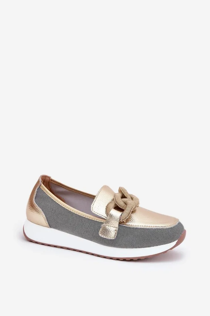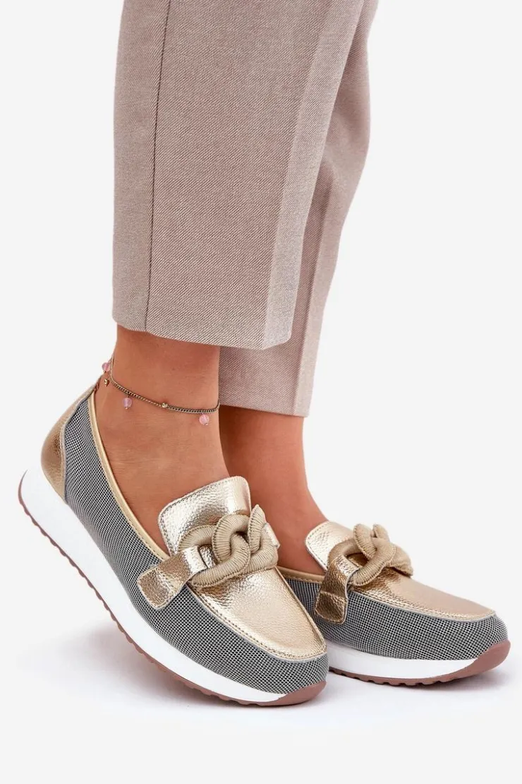 Mokasyny damskie wykonane z połączenia naturalnej skóry i materiału tekstylnego, które łączą elegancję z wygodą. Noski zaokrąglone zapewniają komfort, a ozdoba w formie łańcucha z przodu dodaje im wyjątkowego charakteru. Osadzone na delikatnej platformie, oferują stabilność i lekkość, a miękka wkładka gwarantuje wygodę przez cały dzień. Te mokasyny będą doskonałym wyborem do codziennych, jak i eleganckich stylizacji, łącząc modny wygląd z funkcjonalnością. Przy wyborze rozmiaru prosimy sugerować się tabelą rozmiarów.