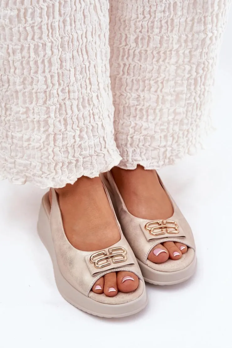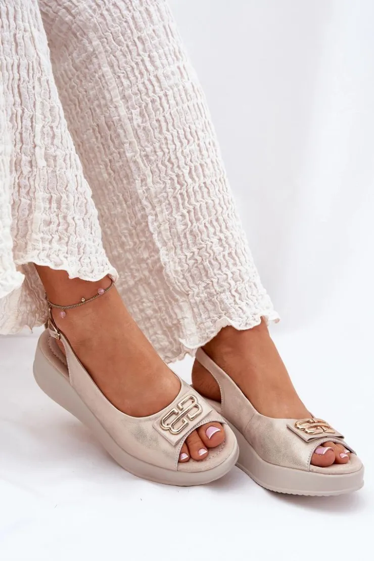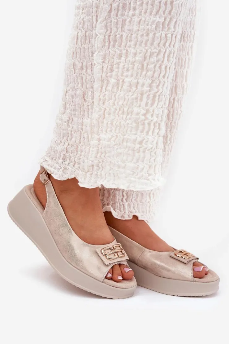 Damskie Damskie buty S.Barski Skórzane Sandały Damskie Na Koturnie Z Ozdobnym Detalem S.Barski LR51-593 Złote