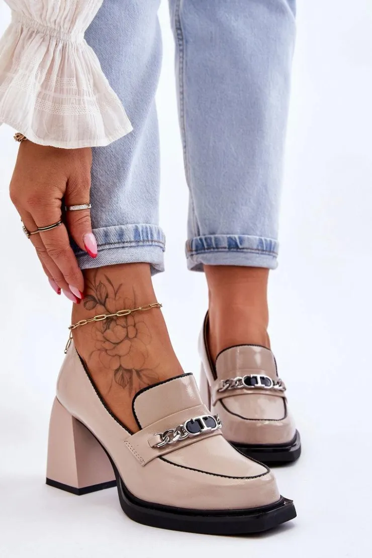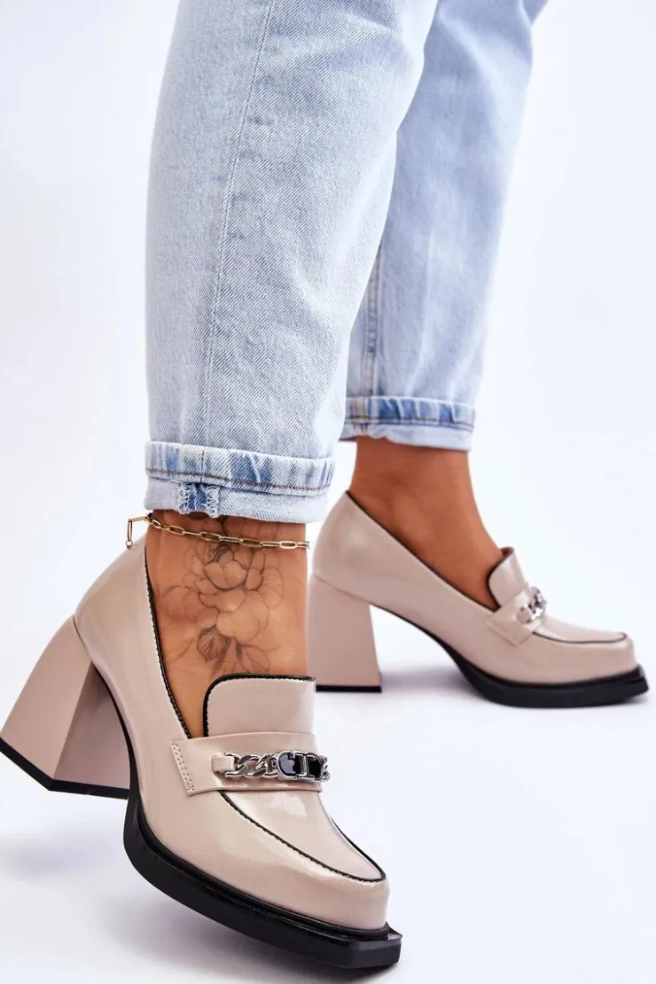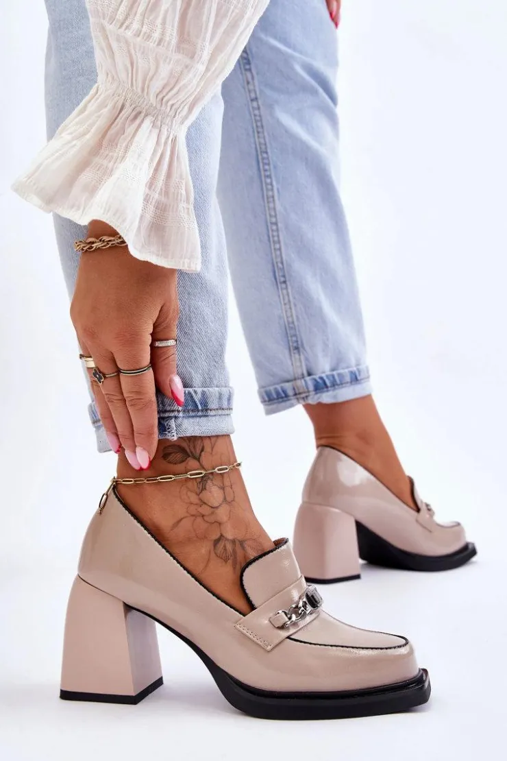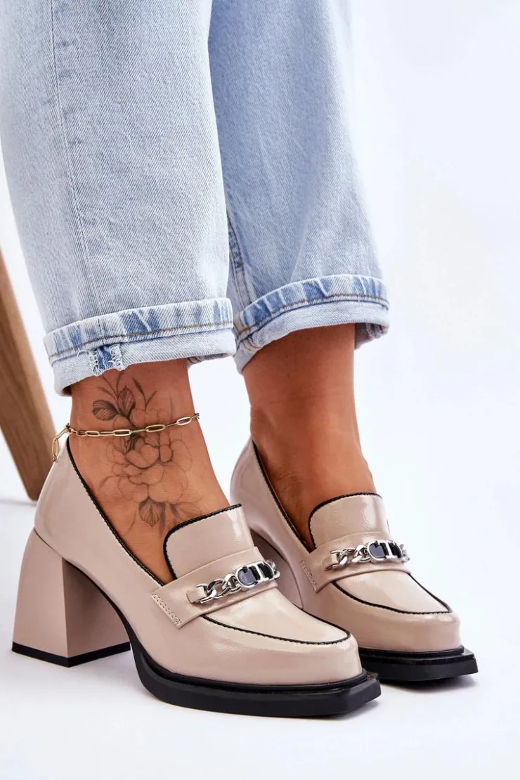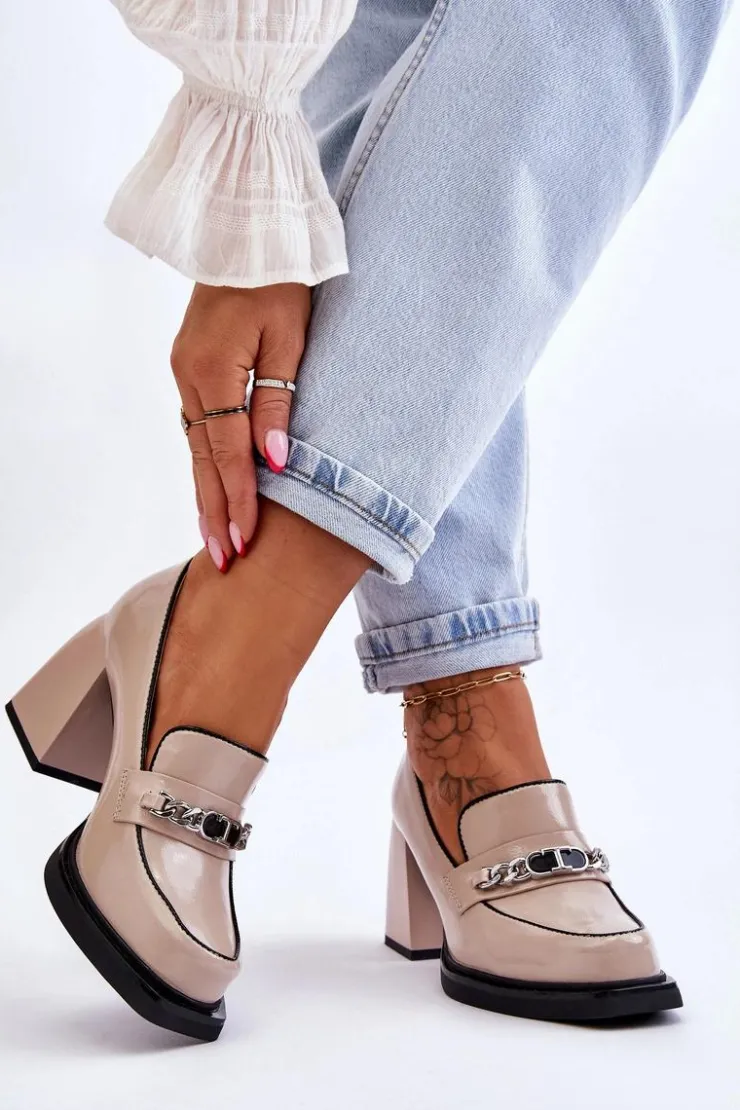 Wygodne czółenka dla każdej kobiety ceniącej sobie komfort i piękno na każdym kroku! Te modne czółenka zostały wykonane z eko skóry i ozdobione łańcuszkiem i emblematem. Osadzono je na delikatnej platformie oraz masywnym obcasie w postaci klocka. Dodatkowo posiadają usztywniany zapiętek. Koniecznie powinnaś mieć ten model w swojej szafie! Przy wyborze rozmiaru prosimy sugerować się tabelą rozmiarów.